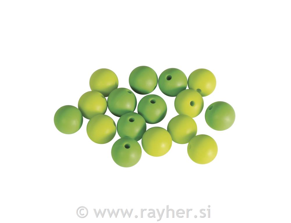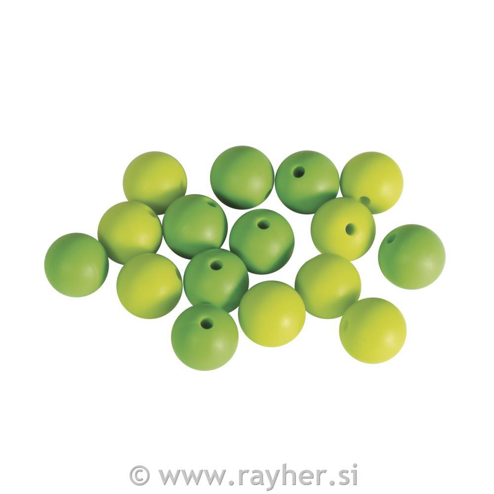 Okrogle silikonske perle imajo velikost o 15 mm in so na voljo v številnih svetlih barvnih kombinacijah.