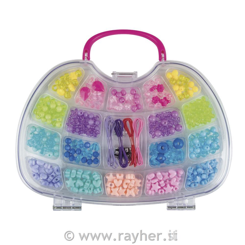 Pastelno obarvane perlice in motivi (srce, cvet, zvezda, fasetirane perlice) ter 4 elastične niti, vsaka dolga 1 m, so varno in funkcionalno shranjeni v praktični akrilni škatli z ročajem in zapiralko. Različni premeri perlic in lukenj ter količine kroglic.