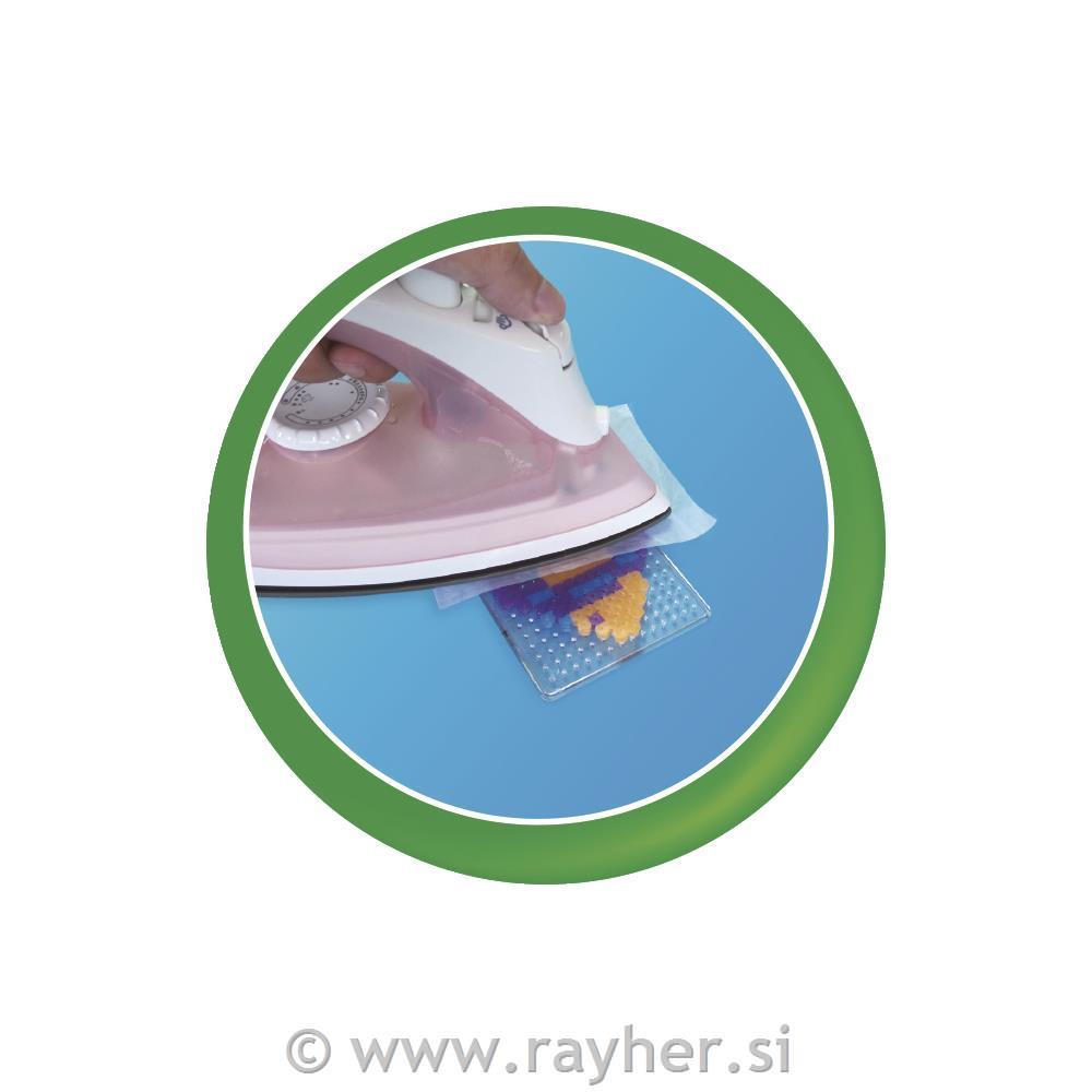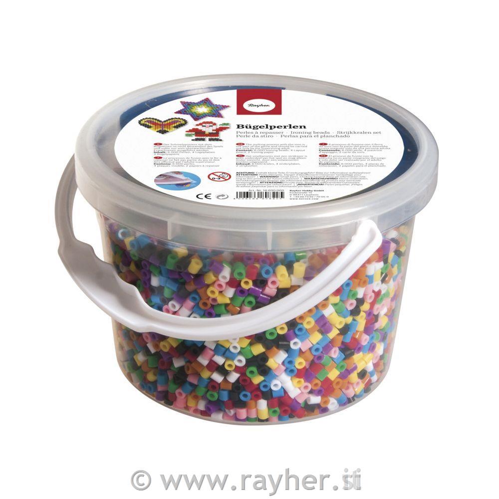 V priročnem plastičnem vedru je 6000 plastičnih perl za zalikanje, podlaga za nameščanje perl in papir za peko preko katerega perle polikate in dobite želeni motiv zlepljen v en kos.