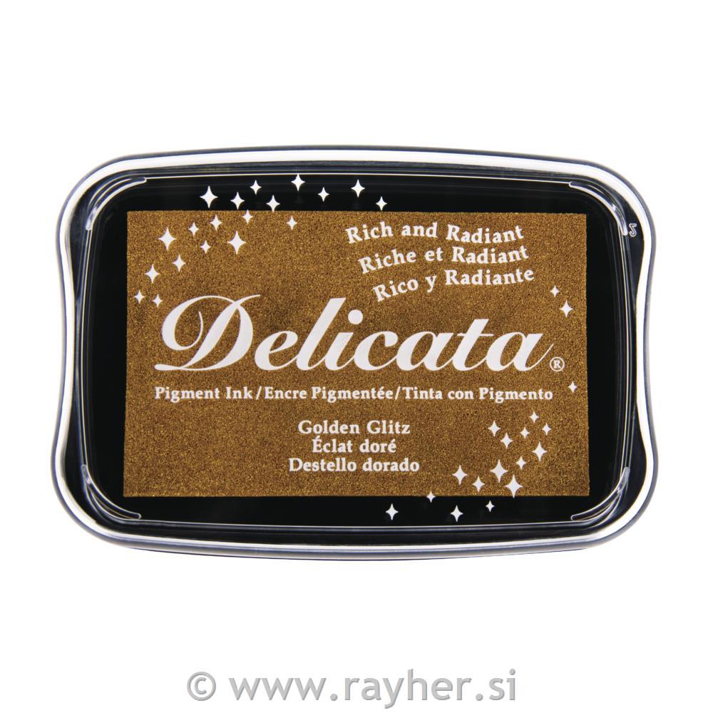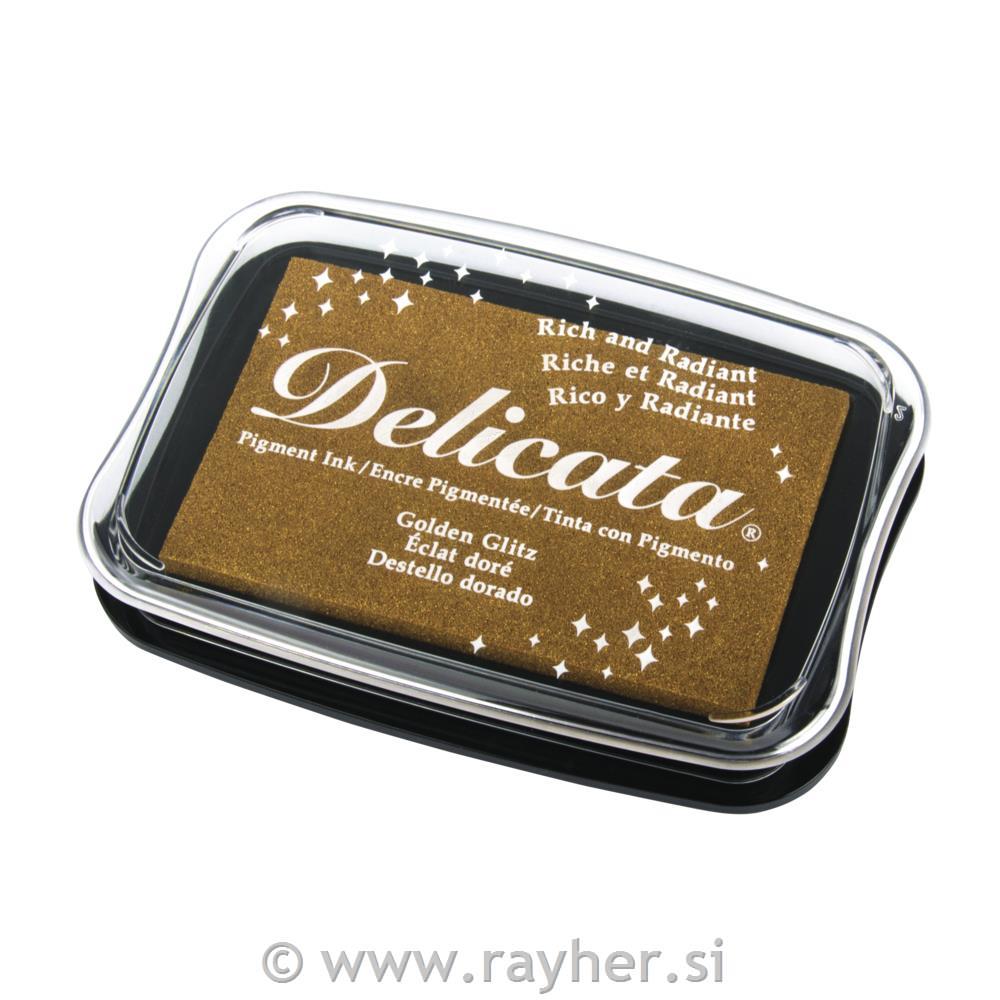 Tsukineko Delicata pigmentna blazinica z izjemno kovinsko barvo, ki ne zbledi in ne izgubil leska. Hitro se posuši na poroznih papirjih in naredijo čudovit efekt na različnih barvnih papirjih ali katronih. Odlične so tudi za šabloniranje na papirju. Niso primerne za tekstil.