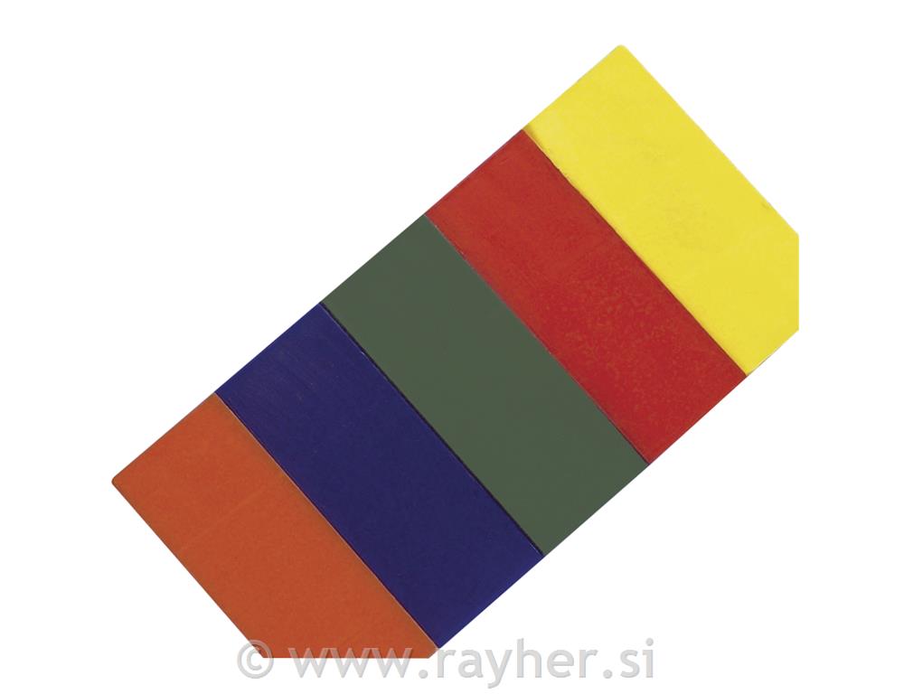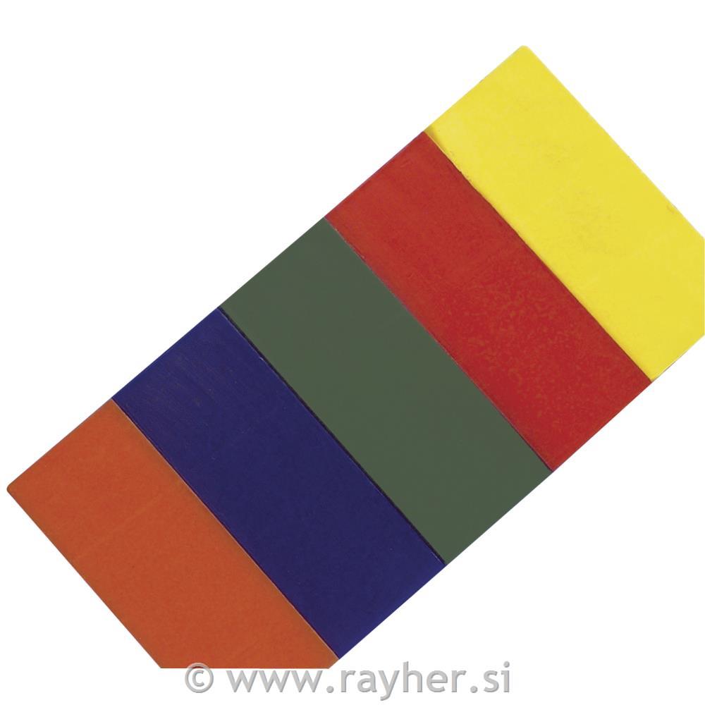 Komplet vsebuje 5 listov v oranžni, modri, zeleni, rdeči in rumeni barvi, vsak meri 4x10 cm in je debel 5 mm. Preprosto odrežite potrebno količino. Vosek je zelo upogljiv, za modeliranje pa zadostuje ročna toplota. Z njim lahko čudovito okrasite tudi nepobarvane sveče.