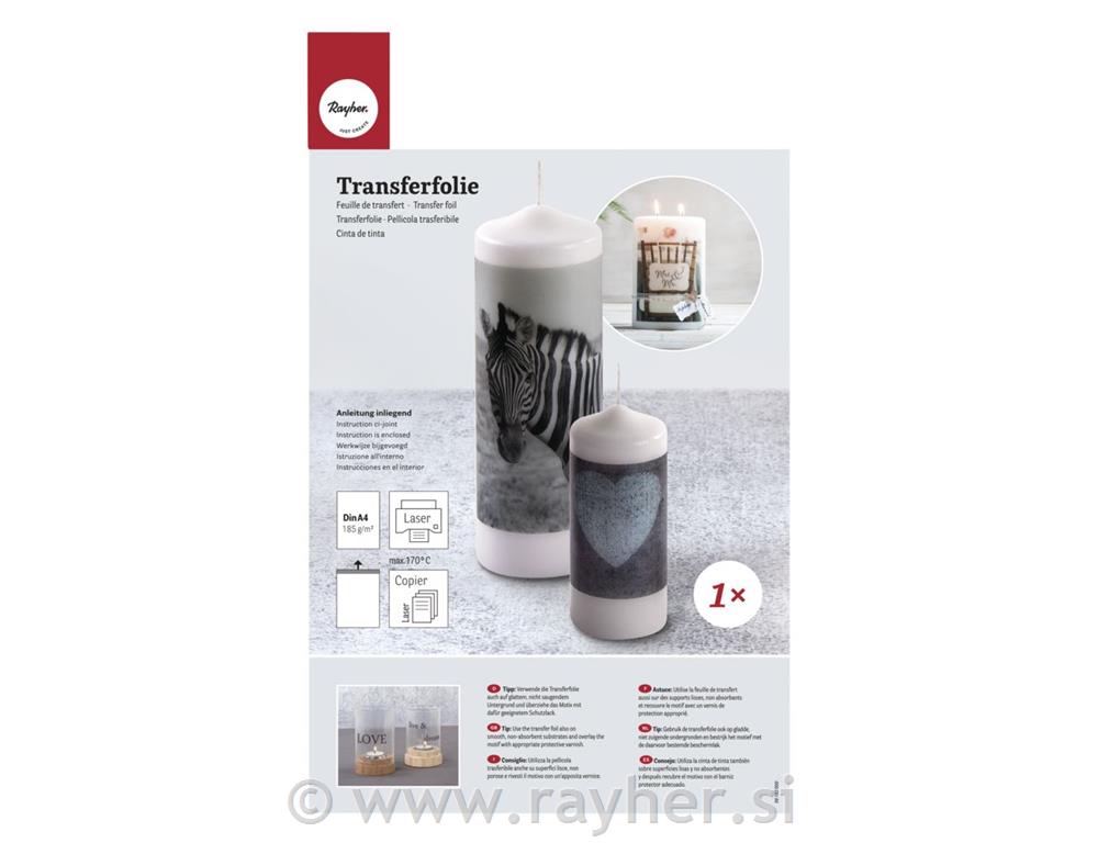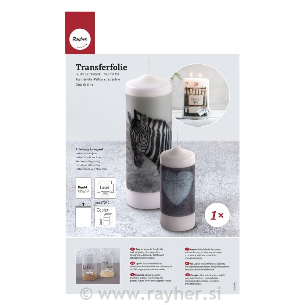 Z laserskim tiskalnikom na svetlečo stran folije natisnite poljuben motiv. Če želite uporabiti le del motiva, ga s škarjami izrežite. Potopite natisnjen motiv v toplo vodo za 30 do 60 sekund, dokler se papir ne loči od folije. Folijo z natisnjenim motivom prenesite na svečo ali na katerokoli drugo gladko in nevpojno površino - steklo, keramiko ipd.