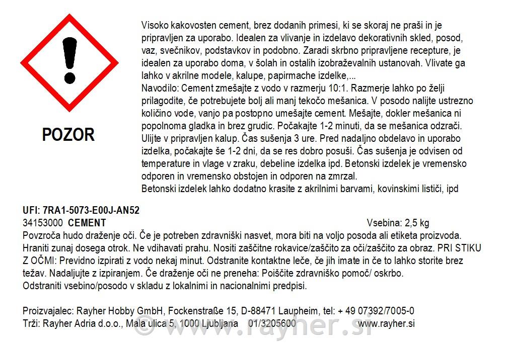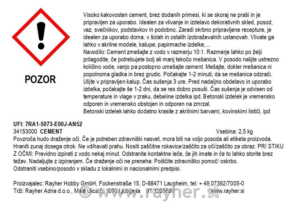 Navodilo: Cement zmešajte z vodo v razmerju 10:1. Razmerje lahko po želji prilagodite, če potrebujete bolj ali manj tekočo mešanica. V posodo nalijte ustrezno količino vode, vanjo pa postopno umešajte cement. Mešajte, dokler mešanica ni popolnoma gladka in brez grudic. Počakajte 1-2 minuti, da se mešanica odzrači. Ulijte v pripravljen kalup. Čas sušenja - 3 ure. Pred nadaljno obdelavo in uporabo izdelka, počakajte še 1-2 dni, da se res dobro posuši. Čas sušenja je odvisen od temperature in vlage v zraku, debeline izdelka ipd. Betonski izdelek je vremensko odporen in vremensko obstojen in odporen na zmrzal.