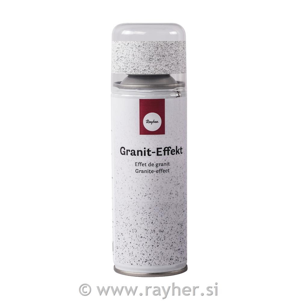 SPREJ - GRANIT EFEKT na različnih površinah ustvari grobo površino, ki ima videz granita. Uporaben na kovini, lesu, steklu, kamnu, keramiki, lepenki in na vseh plastikah, ki so primerne za poslikavo. Uporaben je za notranjo dekoracijo, za zunanjo pa ga morate zaščititi z vremensko obstojnim zaščitnim lakom. Dobro pokriven, dobro oprijemljiv, hitro sušeč.