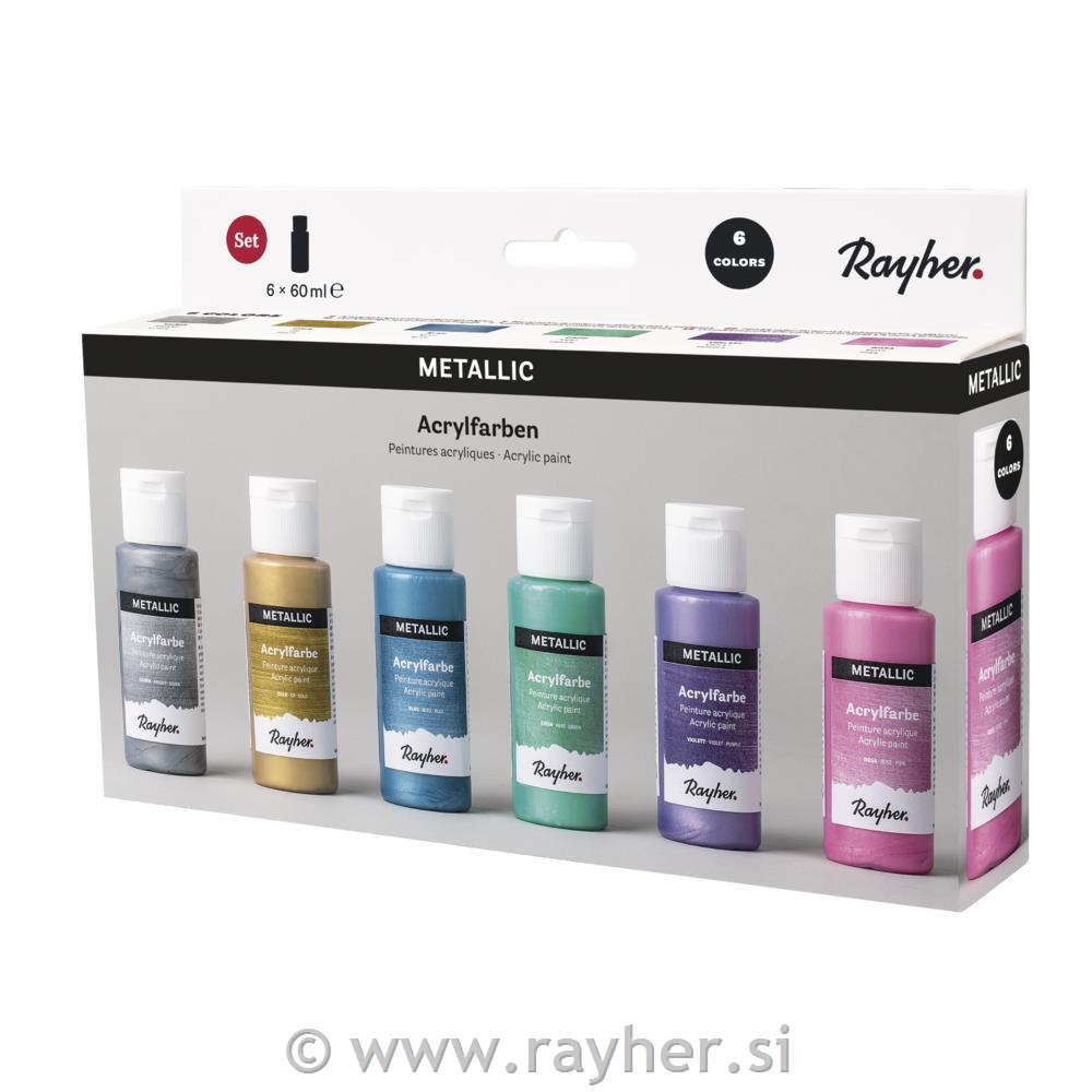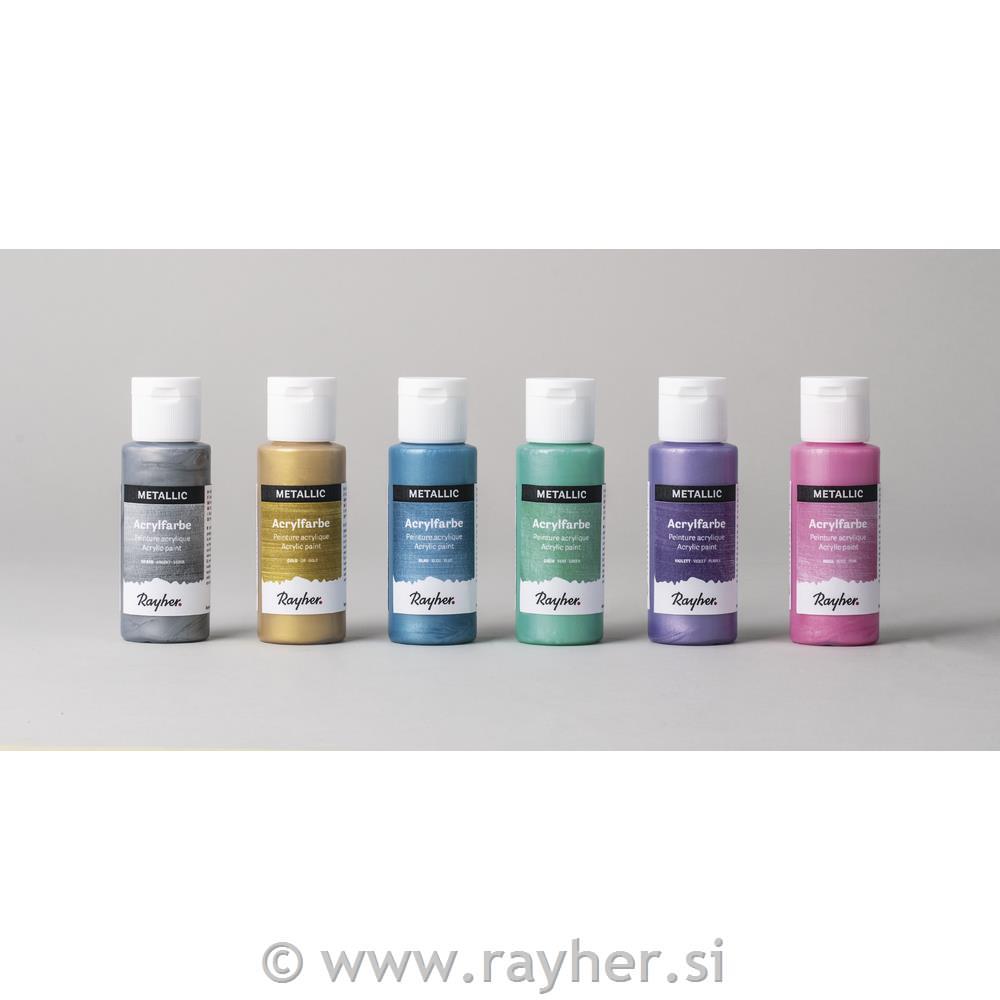 Komplet akrilnih barv s šestimi plemenitimi svetlečimi kovinskimi barvami, vsaka steklenička 60 ml: roza, vijolična, modra, zelena, srebrna, zlata.