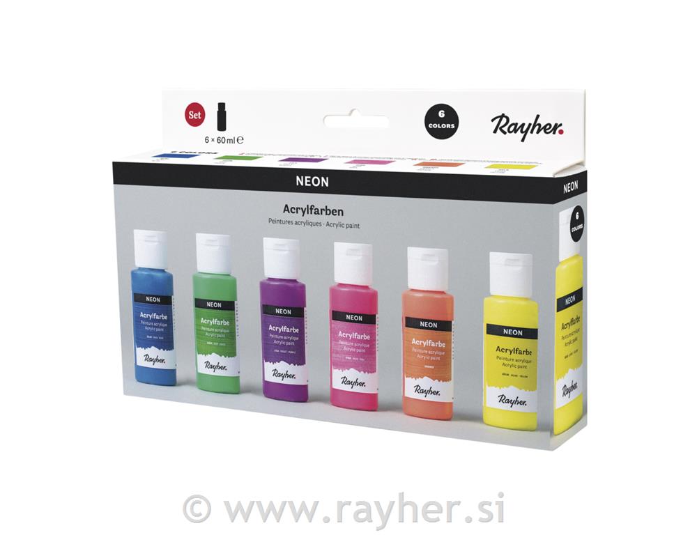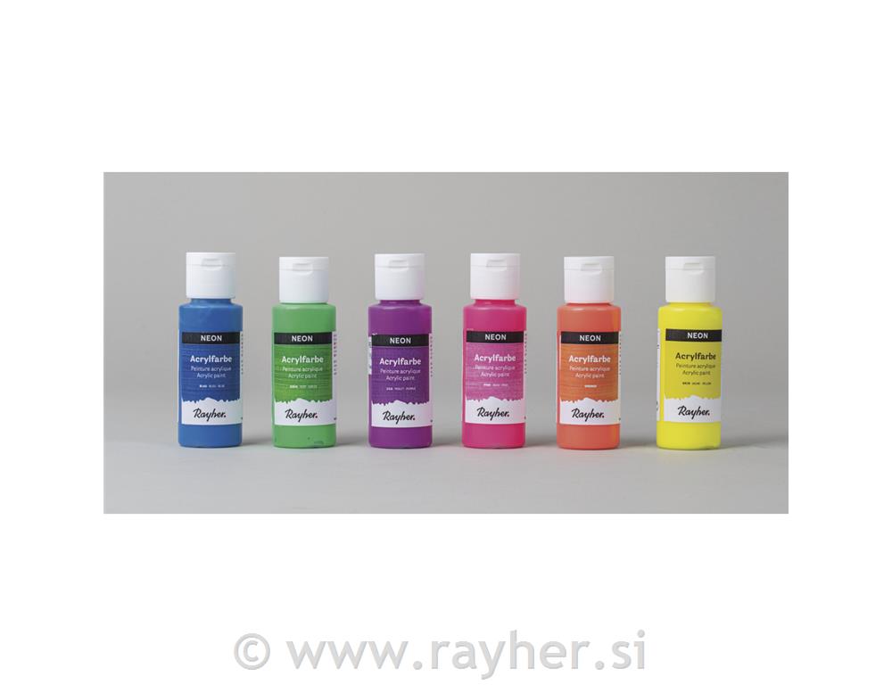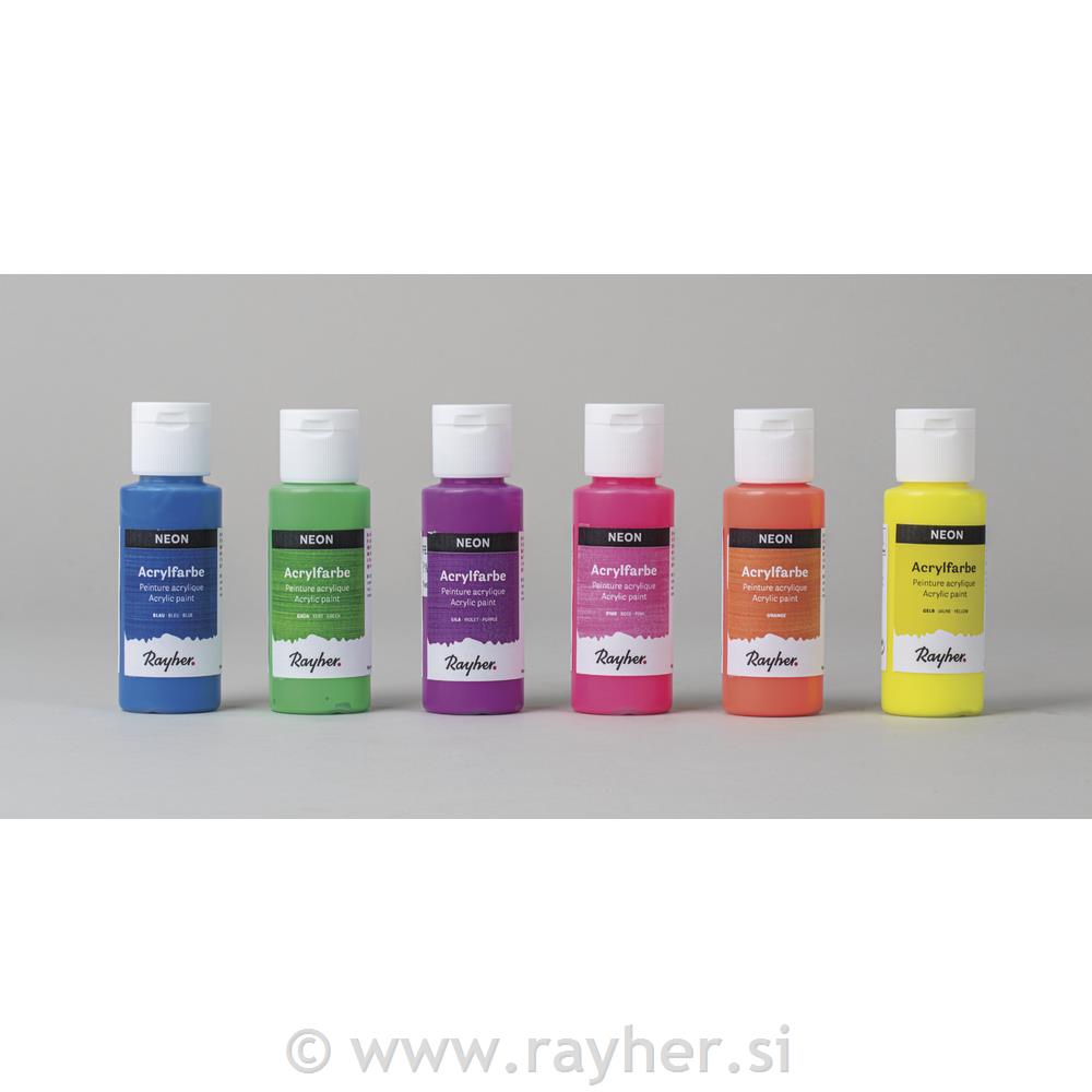 Komplet akrilnih barv s šestimi svetlimi neonskimi barvami, vsaka steklenička 60 ml: denar, oranžna, roza, vijolična, modra, zelena.