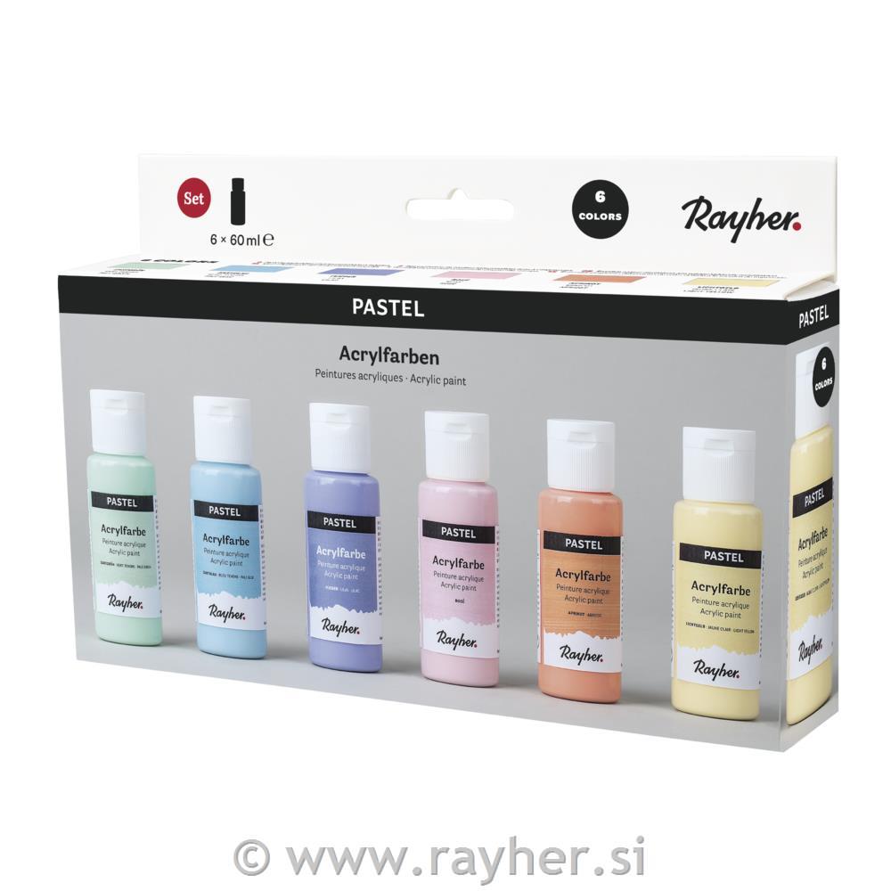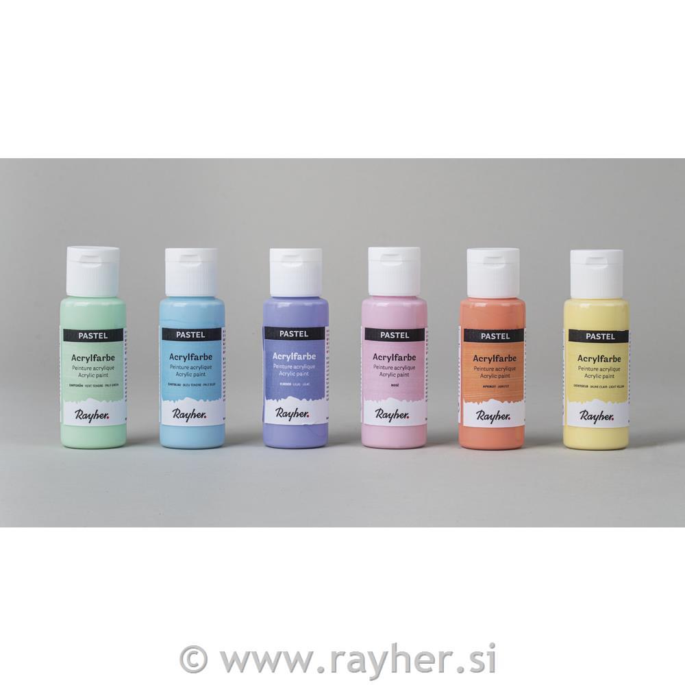 Komplet akrilnih barv s šestimi nežnimi pastelnimi barvami, vsaka steklenička 60 ml: svetlo rumena, marelična, rožnata, lila, svetlo modra, svetlo zelena.