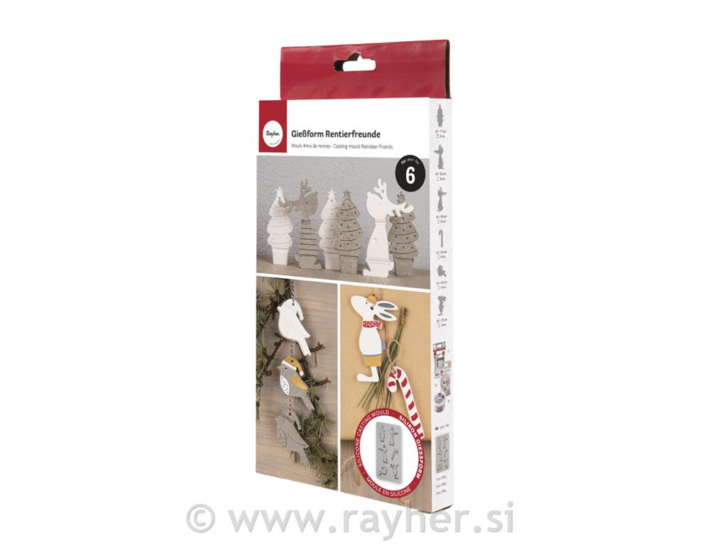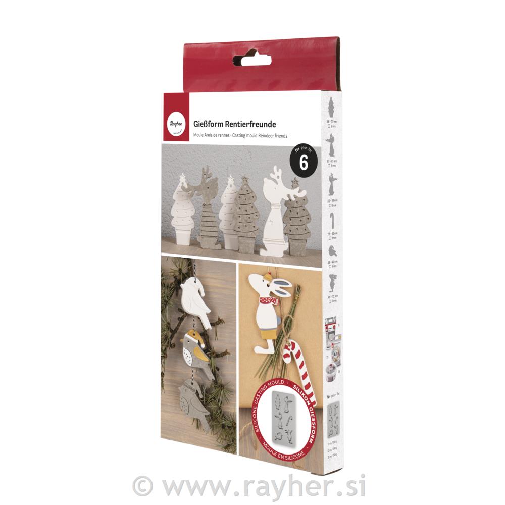 Kalup za ulivanje iz visokokakovostnega silikona, izjemno elastičen, dimenzijsko stabilen in odporen proti zmrzali/toploti (-40°C do +240°C). Zaradi raztegljivega silikonskega materiala je še posebej enostavno odstraniti ulite obeske po sušenju. Nato kalup očistite z vodo in po možnosti z malo tekočine za pomivanje posode, ki jo lahko uporabljate znova in znova. Ena od prednosti so majhni zatiči za luknje za obešanje, ki so vgrajeni v vrh motivov, ki vam olajšajo naknadno navijanje obročev, trakov itd.