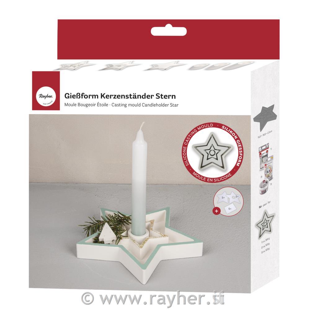 Kalup za vlivanje Svečnik Zvezda, 18,5 x 18,5 cm, višina 2,5 cm, vključno s 3 različnimi šablonami iz folije (5 kosov na vsako).