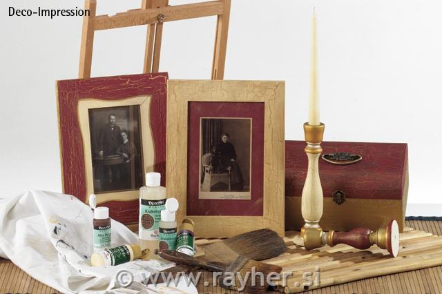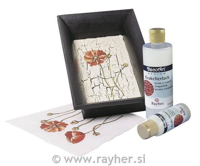 Navodilo: Podlago najprej pobarvamo z akrilno barvo. Ko je barva povsem suha, nanesemo lak za razpokanje in počakamo, da je lak lepljiv na dotik in nato še enkrat nanesemo akrilno barvo.