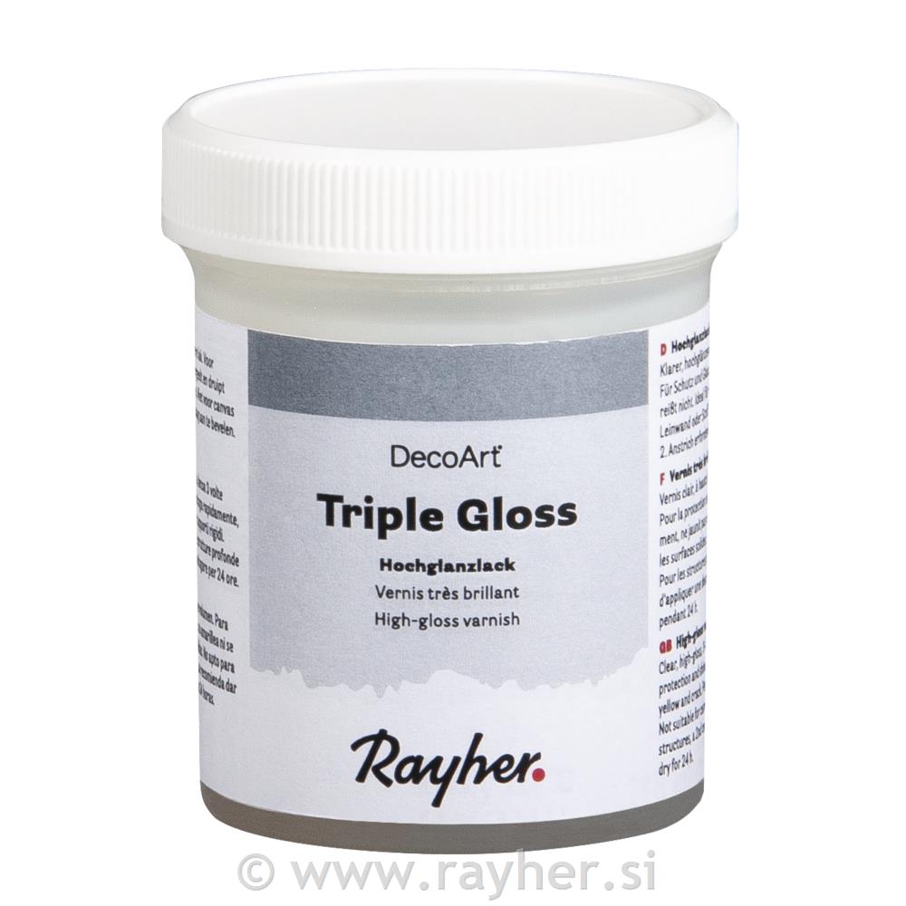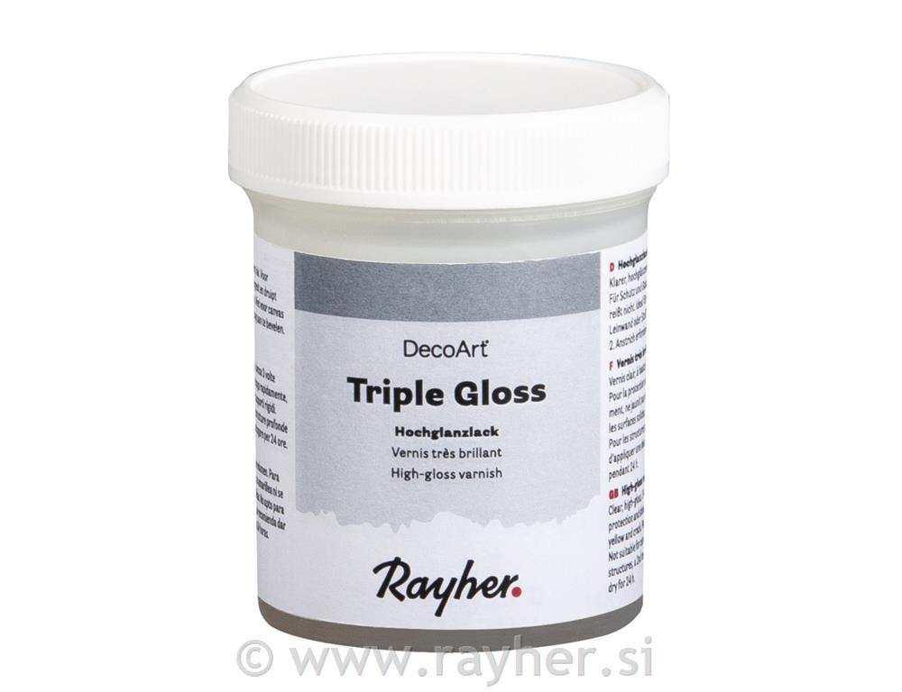 Triple Gloss je prosojen zaščitni lak s trojnim leskom. Daje videz glaziranja, ne porumeni in ne razpoka. Idealen je za poudarjanje globine barve. Uporablja se na lesu, kovini, keramiki, papirni masi,... Na vpojnihin strukturiranih površinah priporočamo dva nanosa. Med nanosi počakajte 5-10 minut.