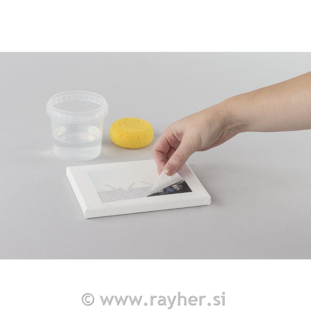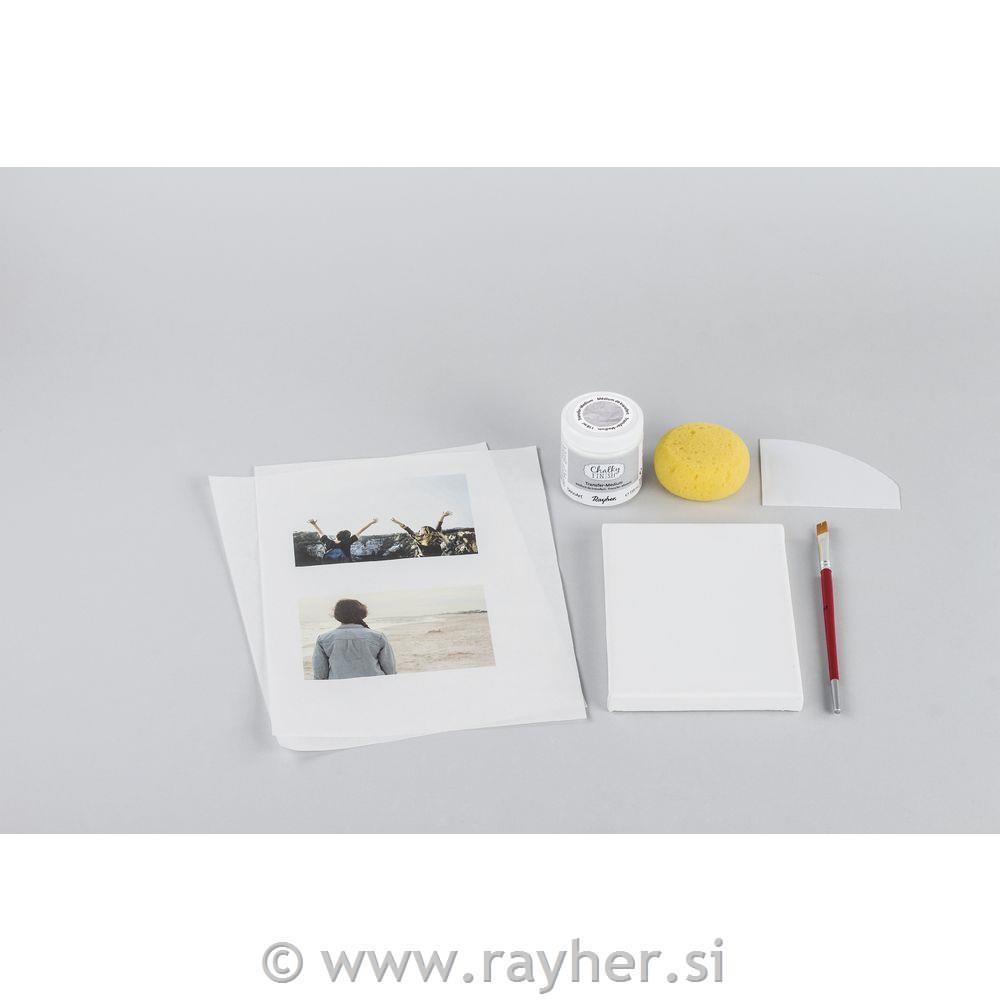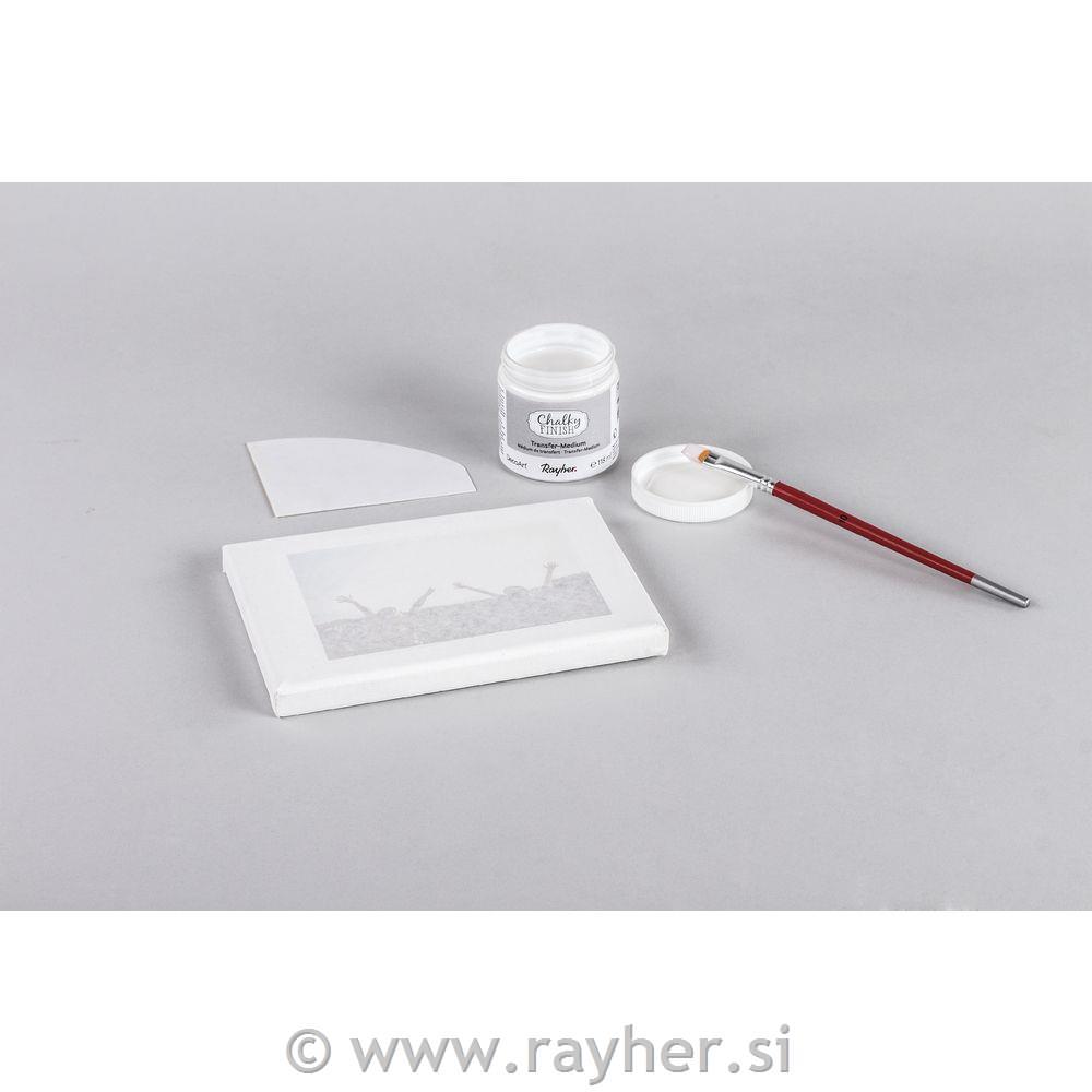 Izdelek pobarvajte s Chalky Finish barvo ali pa ga zaščitite s Chalky Finish konzervatorjem. Počakajte, da se nanos posuši (čez noč). Z brusnim papirjem površino zbrusite, da je gladka. Odstranite prah, ki je pri tem nastal. Natisnjen motiv obrežite na želeno velikost. Transfer medij nanesite na izdelek na mesto, kamor boste prenesli natisnjem motiv. Prav tako medij nanesite na natisnjen motiv. Nato ga namestite z licem navzdol na mesto, ki ste ga določili. S čopičem odstranite gube in zračne mehurčke. Odvečen trasfer medij previdno odstranite z mehko krpico. Pustite, da se izdelek suši vsaj 8 ur. Nato nanj z gobico ali čopičem nanesite vodo in počakajte 2- 5 minut. Z gobico ali s prstom s krožnimi gibi odstranjujte papir. Če imate pri tem težave, nanj ponovno nanesite malo vode. Nadaljujte s postopkom, dokler ne odstranite vsega papirja in vam na izdelku ostane le natisnjen motiv.