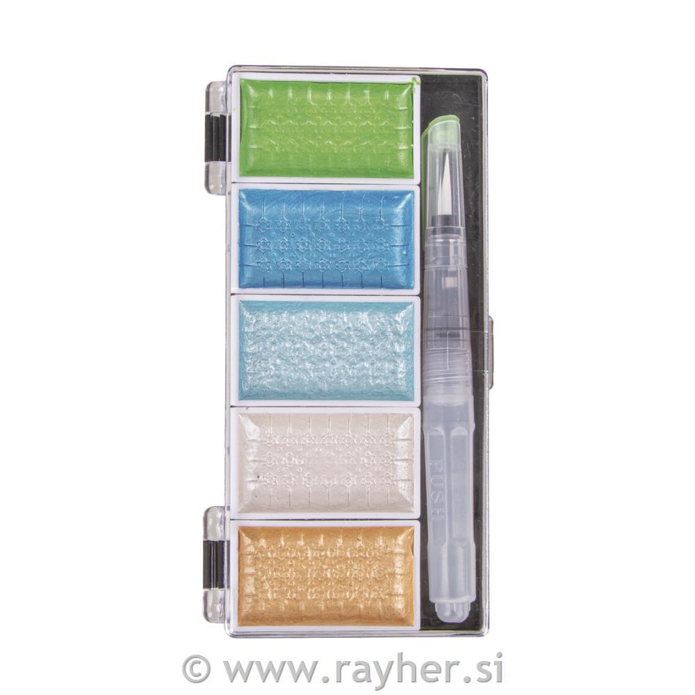 Set Akvarel Metallic, Blue-Green (zeleno-modri odtenki), vsebuje 5 barvnih tabletk 25x45mm in H2O čopič, v katerega se vlije voda.