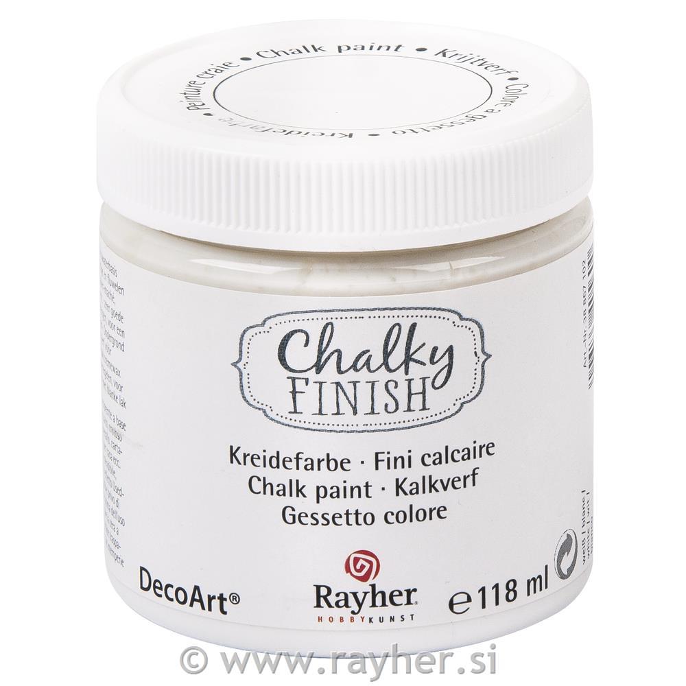 CHALKY FINISH kredne barve 118 ml dobro pokrivna barva na vodni osnovi, kredasto žametnega mat videza, omogoča doseganje različnih stilov - "cottage" do tradicionalnega, "country" do sodobnega. Podlage pred nanosom barve ni potrebno posebej pripraviti. Nanašamo jo lahko na različne podlage - pohištvo, stene, dekorativno steklo, kovino,... Barva ima dober oprijem in pokrivnost. Končni videz barve enostavno postaramo s patinami ali pa površino nežno pobrusimo z brusnim papirjem. V kolikor barvo nanašamo na neobdelan les, lahko olja/smole v lesu prehajajo skozi barvo. Preverite na skritem delu izdelka in v primeru, da opazite prehajanje olj/smol uporabite artikel 38882000 Konzervator.