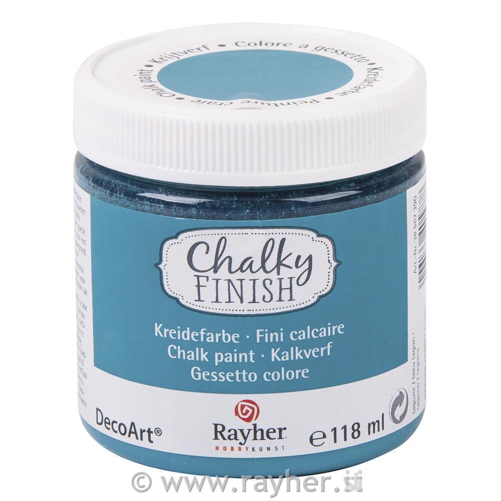CHALKY FINISH kredne barve 118 ml dobro pokrivna barva na vodni osnovi, kredasto žametnega mat videza, omogoča doseganje različnih stilov - "cottage" do tradicionalnega, "country" do sodobnega. Podlage pred nanosom barve ni potrebno posebej pripraviti. Nanašamo jo lahko na različne podlage - pohištvo, stene, dekorativno steklo, kovino,... Barva ima dober oprijem in pokrivnost. Končni videz barve enostavno postaramo s patinami ali pa površino nežno pobrusimo z brusnim papirjem. V kolikor barvo nanašamo na neobdelan les, lahko olja/smole v lesu prehajajo skozi barvo. Preverite na skritem delu izdelka in v primeru, da opazite prehajanje olj/smol uporabite artikel 38882000 Konzervator.