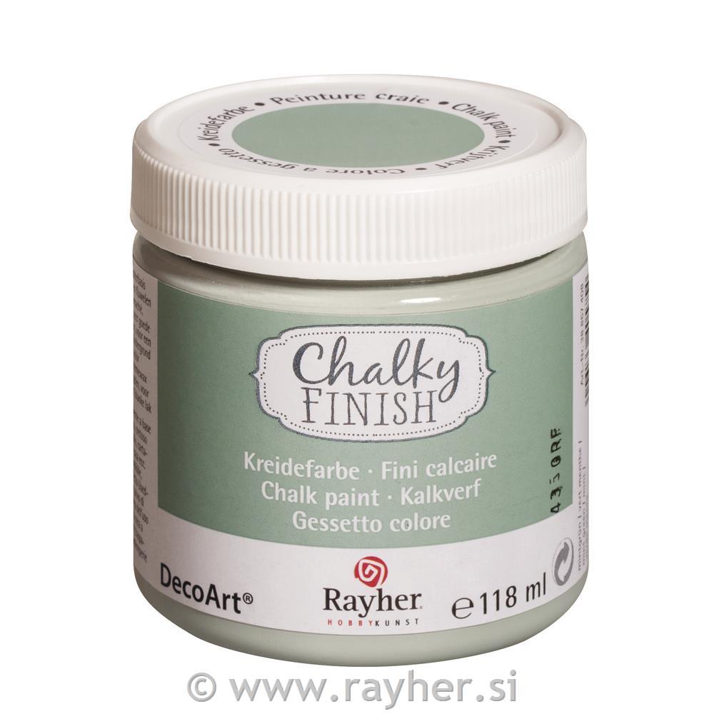 CHALKY FINISH kredne barve 118 ml dobro pokrivna barva na vodni osnovi, kredasto žametnega mat videza, omogoča doseganje različnih stilov - "cottage" do tradicionalnega, "country" do sodobnega. Podlage pred nanosom barve ni potrebno posebej pripraviti. Nanašamo jo lahko na različne podlage - pohištvo, stene, dekorativno steklo, kovino,... Barva ima dober oprijem in pokrivnost. Končni videz barve enostavno postaramo s patinami ali pa površino nežno pobrusimo z brusnim papirjem. V kolikor barvo nanašamo na neobdelan les, lahko olja/smole v lesu prehajajo skozi barvo. Preverite na skritem delu izdelka in v primeru, da opazite prehajanje olj/smol uporabite artikel 38882000 Konzervator.