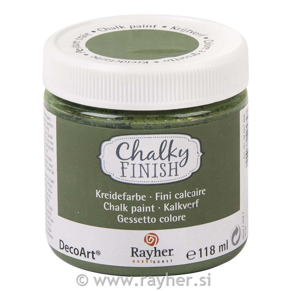 CHALKY FINISH kredne barve 118 ml dobro pokrivna barva na vodni osnovi, kredasto žametnega mat videza, omogoča doseganje različnih stilov - "cottage" do tradicionalnega, "country" do sodobnega. Podlage pred nanosom barve ni potrebno posebej pripraviti. Nanašamo jo lahko na različne podlage - pohištvo, stene, dekorativno steklo, kovino,... Barva ima dober oprijem in pokrivnost. Končni videz barve enostavno postaramo s patinami ali pa površino nežno pobrusimo z brusnim papirjem. V kolikor barvo nanašamo na neobdelan les, lahko olja/smole v lesu prehajajo skozi barvo. Preverite na skritem delu izdelka in v primeru, da opazite prehajanje olj/smol uporabite artikel 38882000 Konzervator.