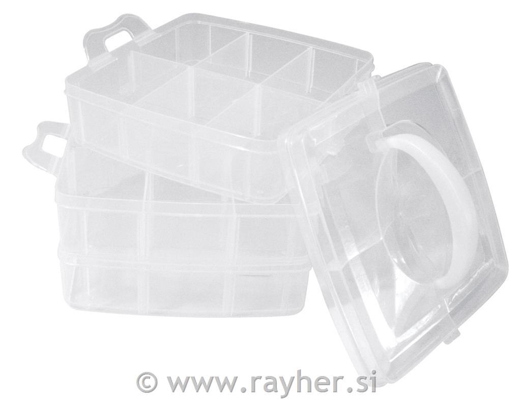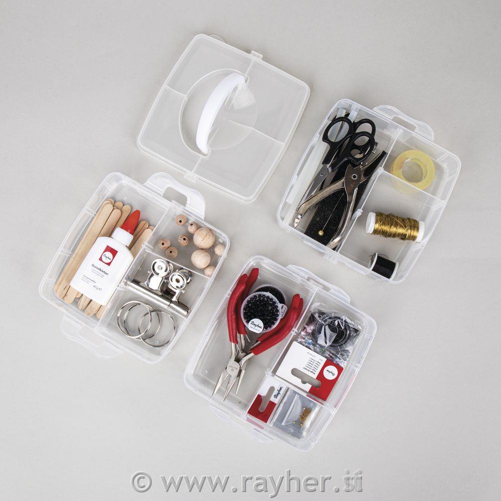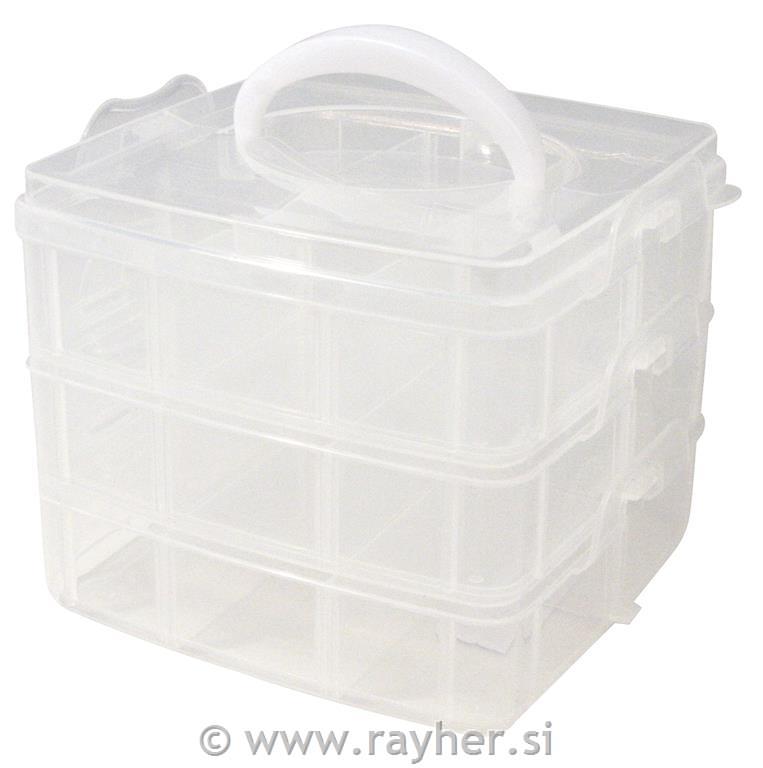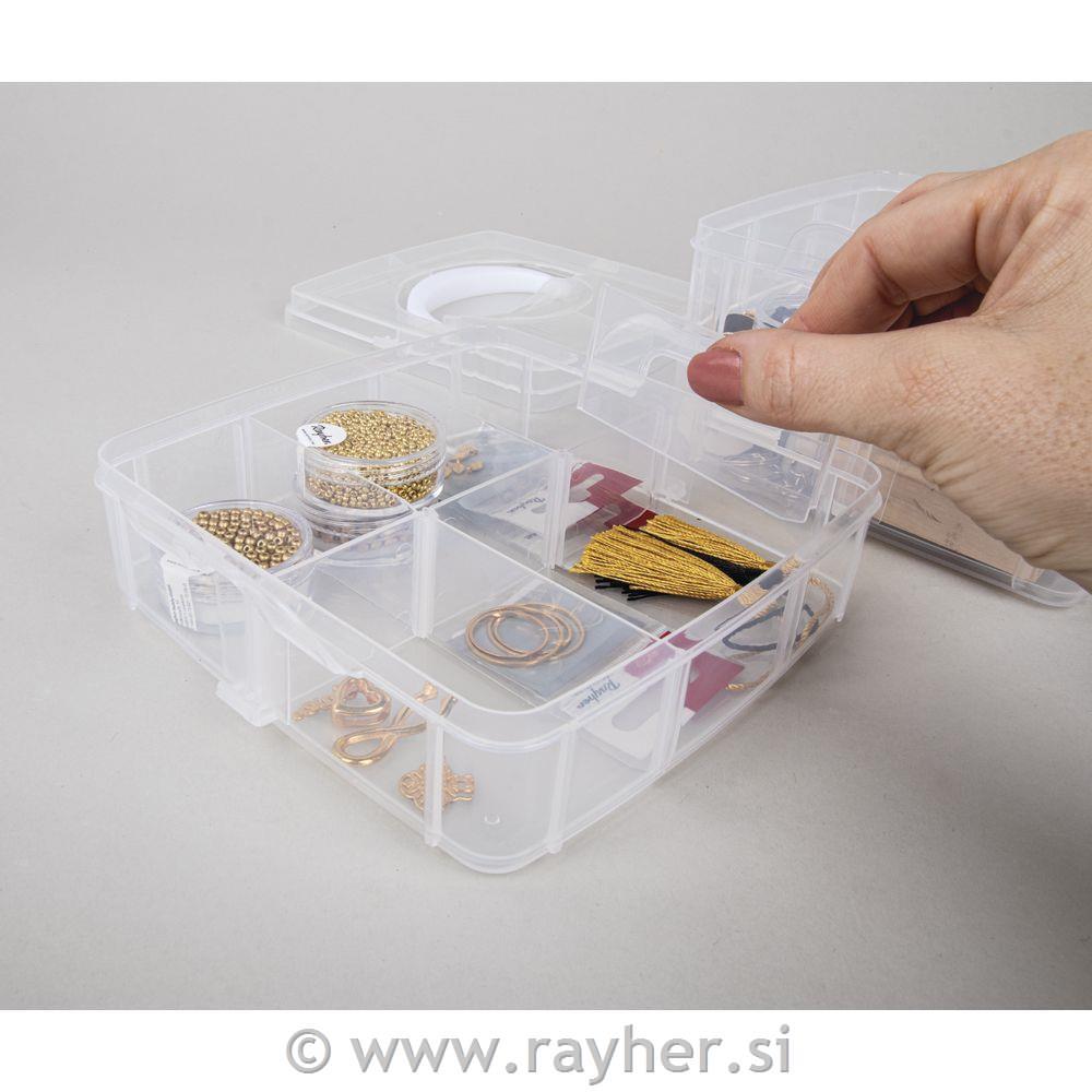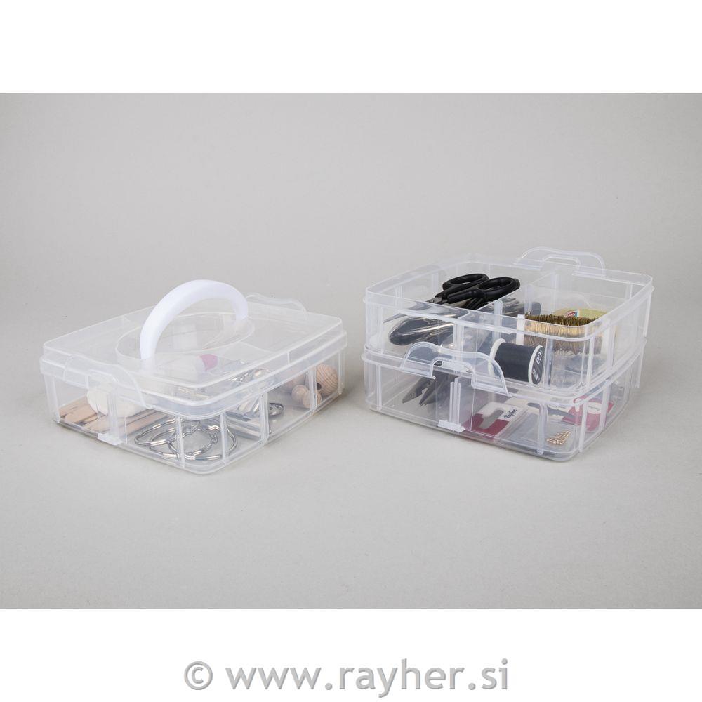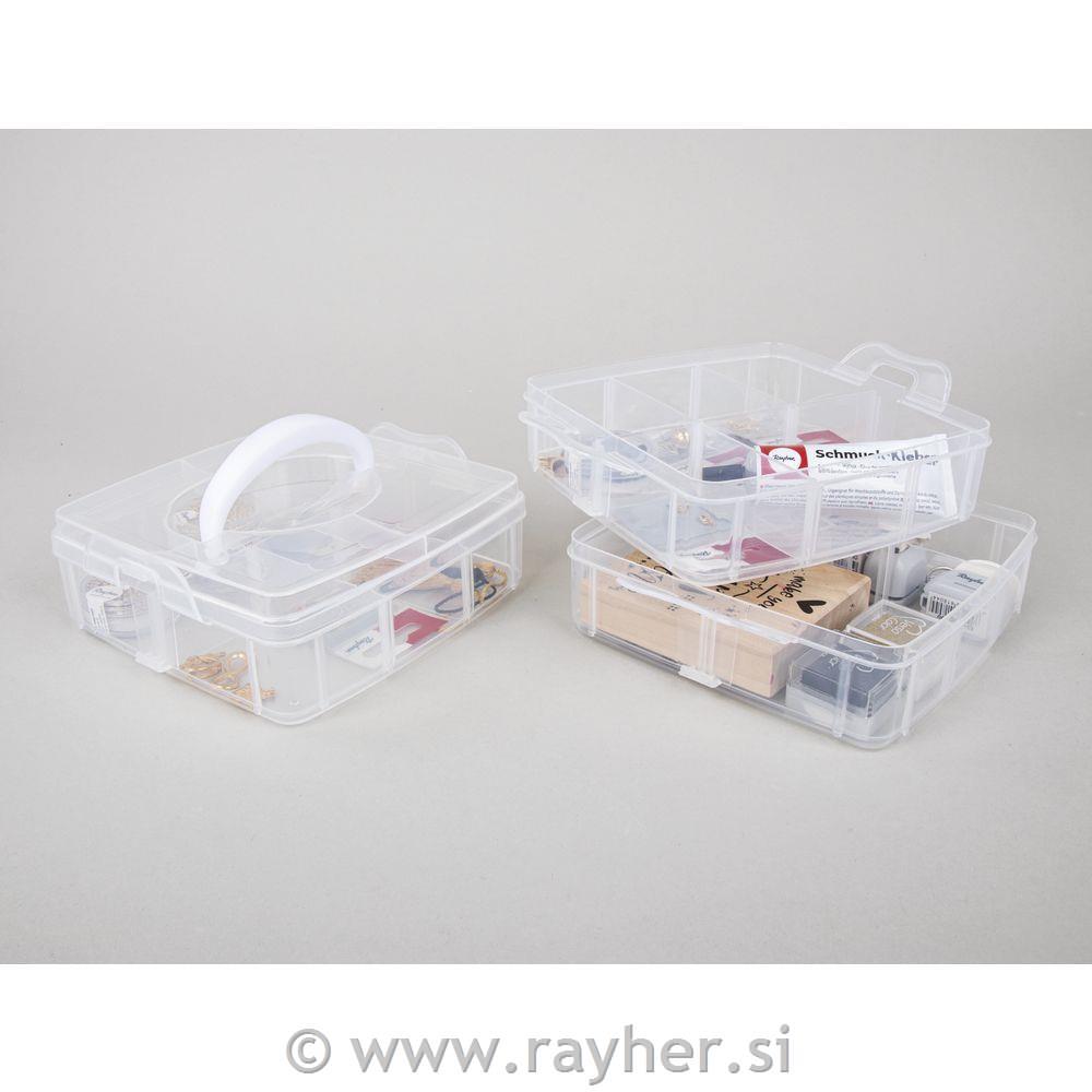 Sortirna škatla z ročajem za prenašanje vsebuje 3 zložljive pladnje s stranskimi zavihki in pokrov z ročajem za prenašanje. Narejena je iz prosojne plastike, ki je enostavna za čiščenje in omogoča vpogled v vsebino. Vsaka škatla ima 6 predelkov, ki jih je mogoče s snemljivimi delilniki dodatno povečati na 14,7 x 14,7 cm. Stopnja polnjenja 3 cm. Pladnje je mogoče enostavno in varno povezati med seboj in s pokrovom s pomočjo loput. Škatla je uporabna ustvarjalni sobi, v otroški oz.mladinski sobi, v gospodinjstvu, delavnici,…