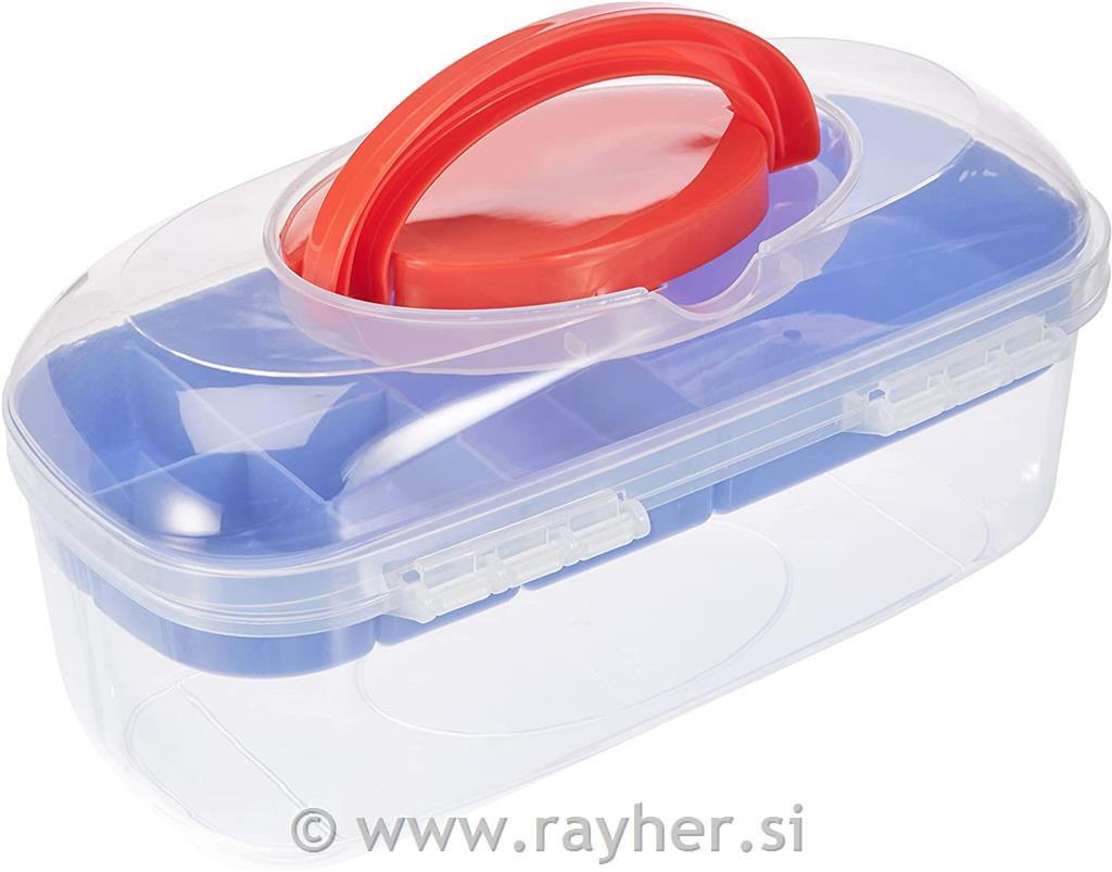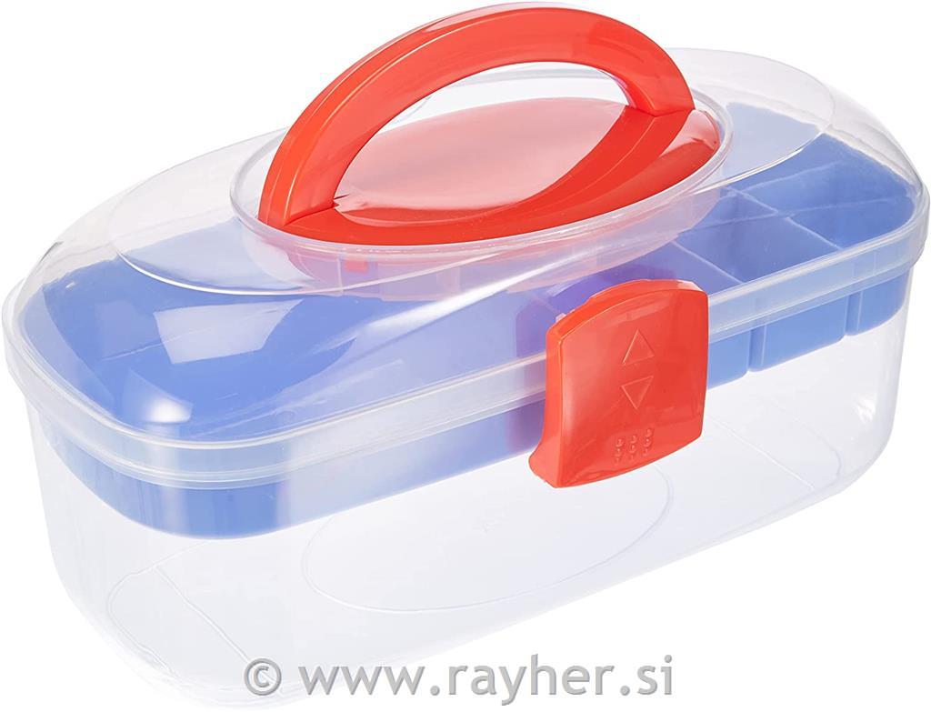 Praktična, vsestranska škatla za shranjevanje iz plastike, z ohlapnim vstavkom na vrhu za majhne dele vseh vrst in velikim predalom za shranjevanje na dnu. Ima praktičen ročaj za prenašanje, zaskočno zapiralo in je enostavna za čiščenje. Vložek ima 6 predelkov različnih velikosti. Vse mere so notranje dimenzije: 1 predal dimenzij 13,5x11,5x3 cm, 1 predal dimenzij 11,5x5,2x3 cm in 4 predelki dimenzij 4x5,5x3 cm. Spodnji predal meri 27,5 x 11,5 cm, ga lahko napolnite do višine 6 cm in je idealno primeren za orodja, kot so klešče za nakit, izvijači, igle za pletenje in kvačkanje, škarje itd. Praktična in vsestranska škatla za shranjevanje je preprosto nepogrešljiva. Primerna je za številne hobije in namene: kot majhna škatla za orodje za dom, za shranjevanje pletilskega ali šivalnega dela, kot škatla za rokodelstvo, za nakit in ročna dela vseh vrst, za obrtnike na poti, za fante in punčke; s seboj nosite igrače in dodatke itd.