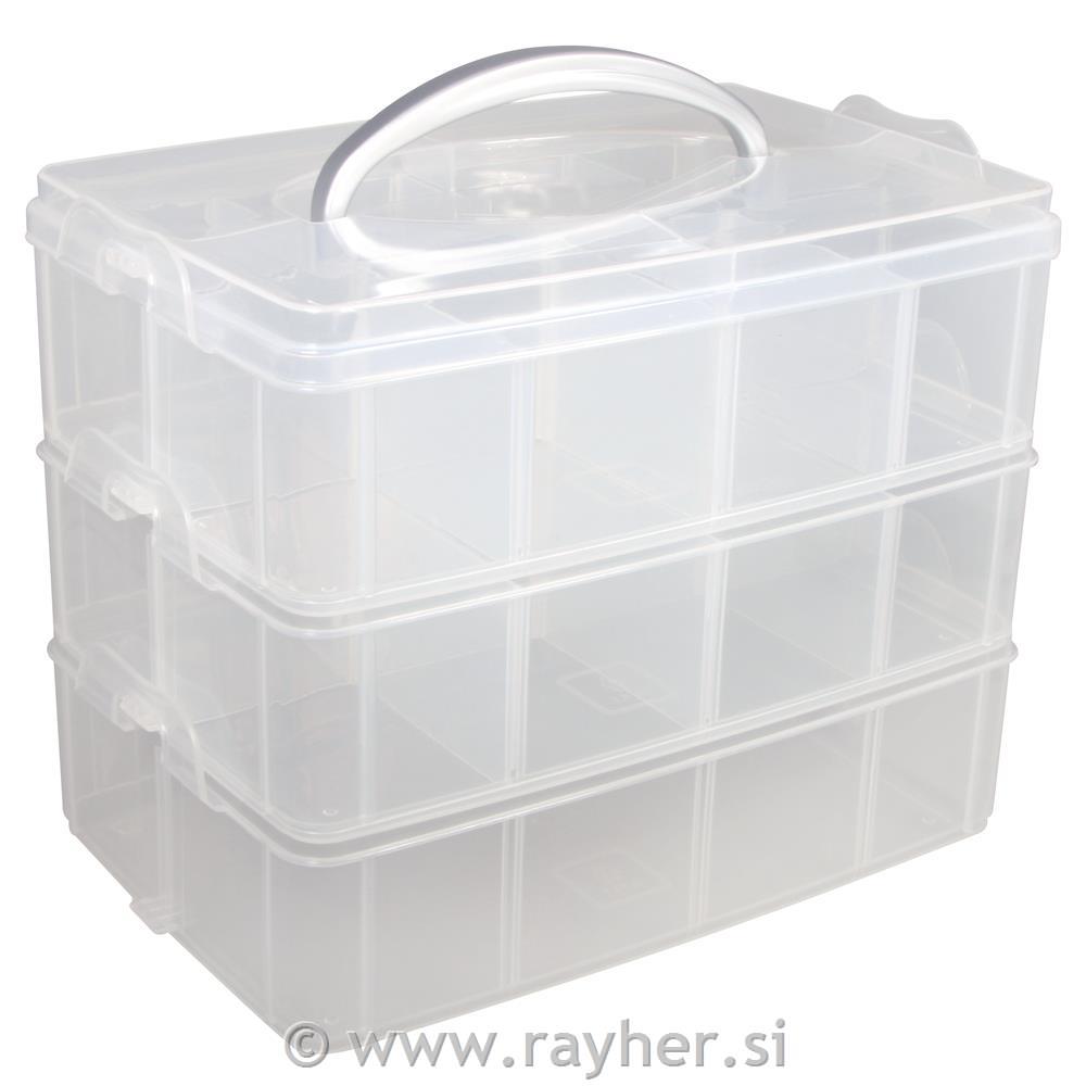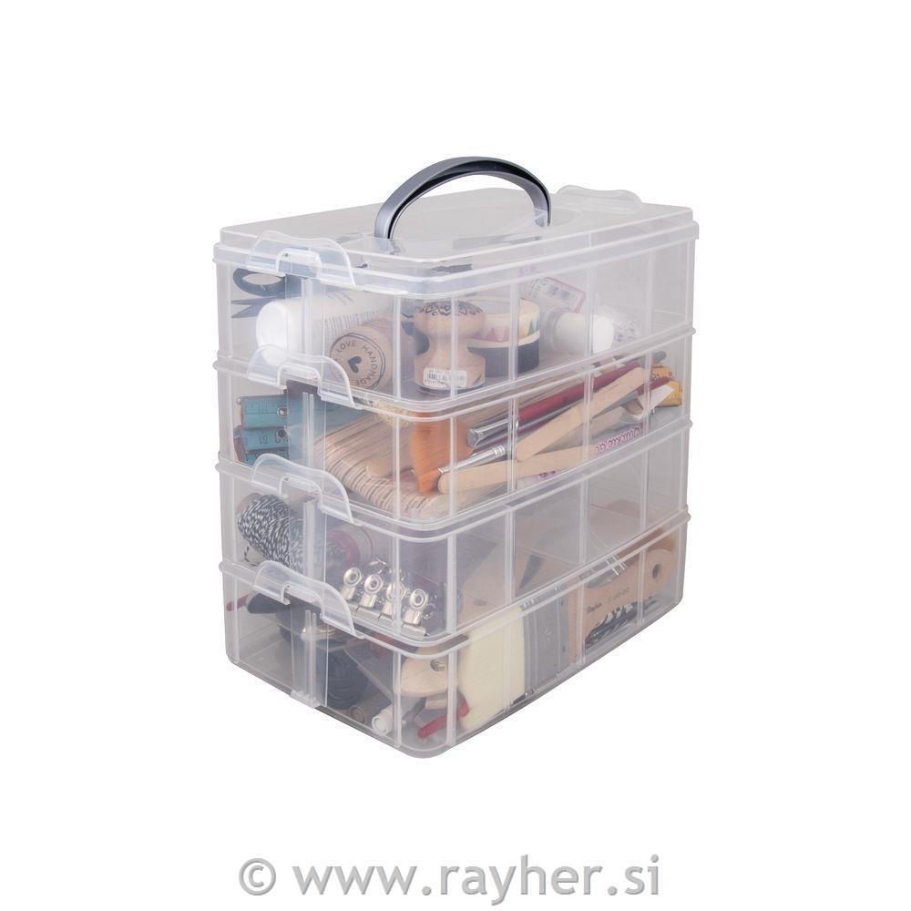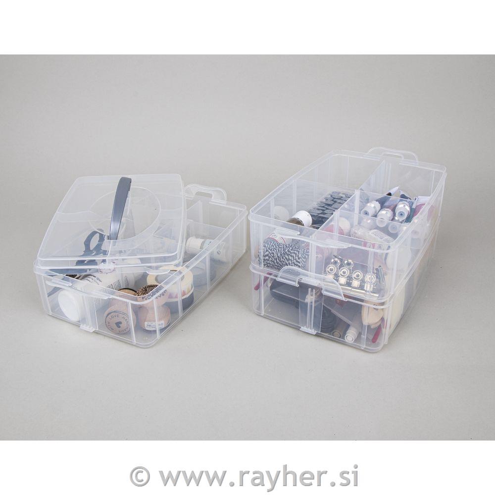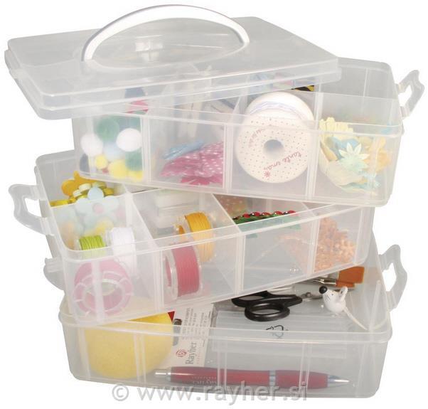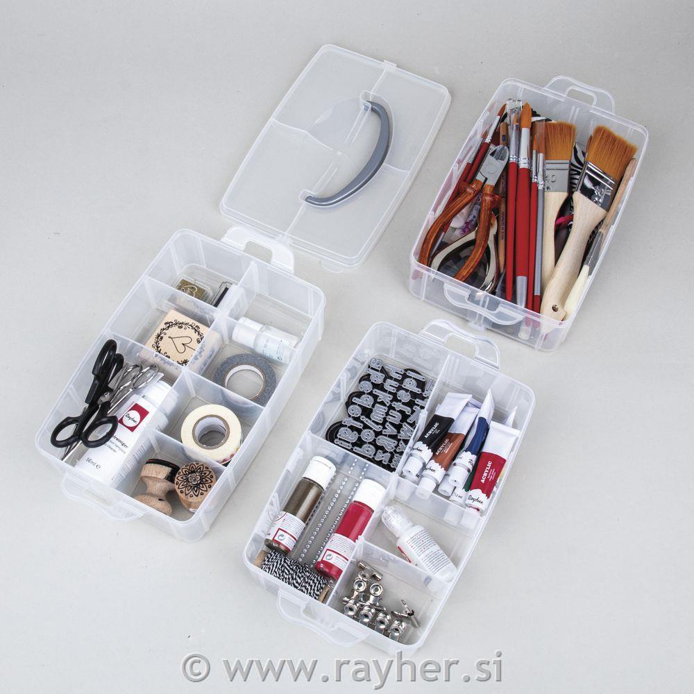 Škatla za shranjevanje je narejena iz čvrste, enostavne za čiščenje, prozorne plastike. Klešče, žice, lepilne palčke, škatle za perle in lesene perle, pa tudi zdravila, pripomočke iz delavnice in vrta ter številne ustvarjalne in obrtne materiale je mogoče enostavno, pregledno in na prostorsko varčen način pospraviti.