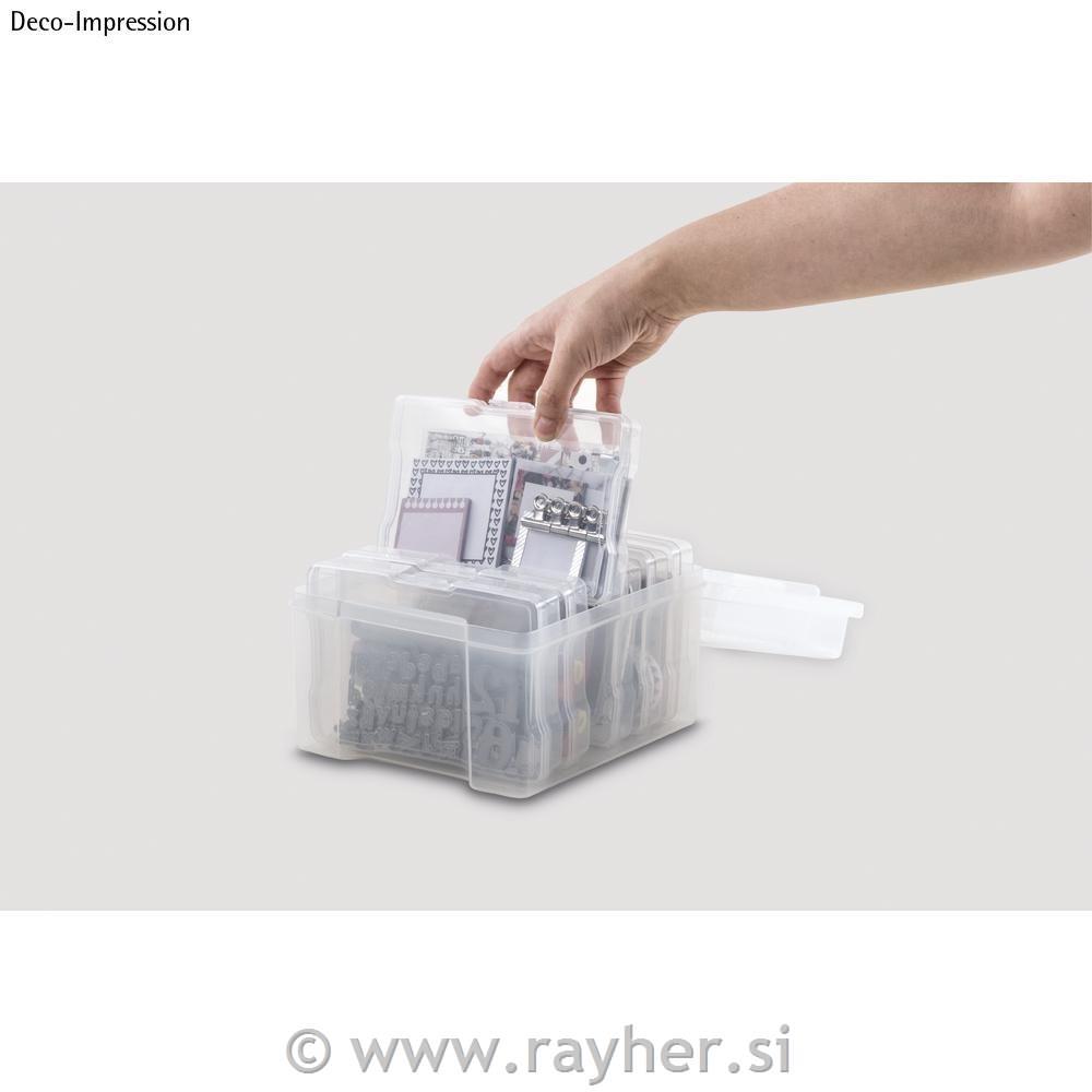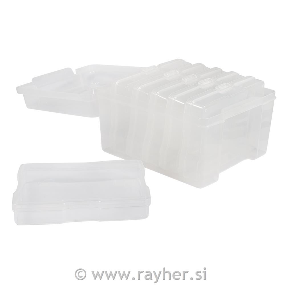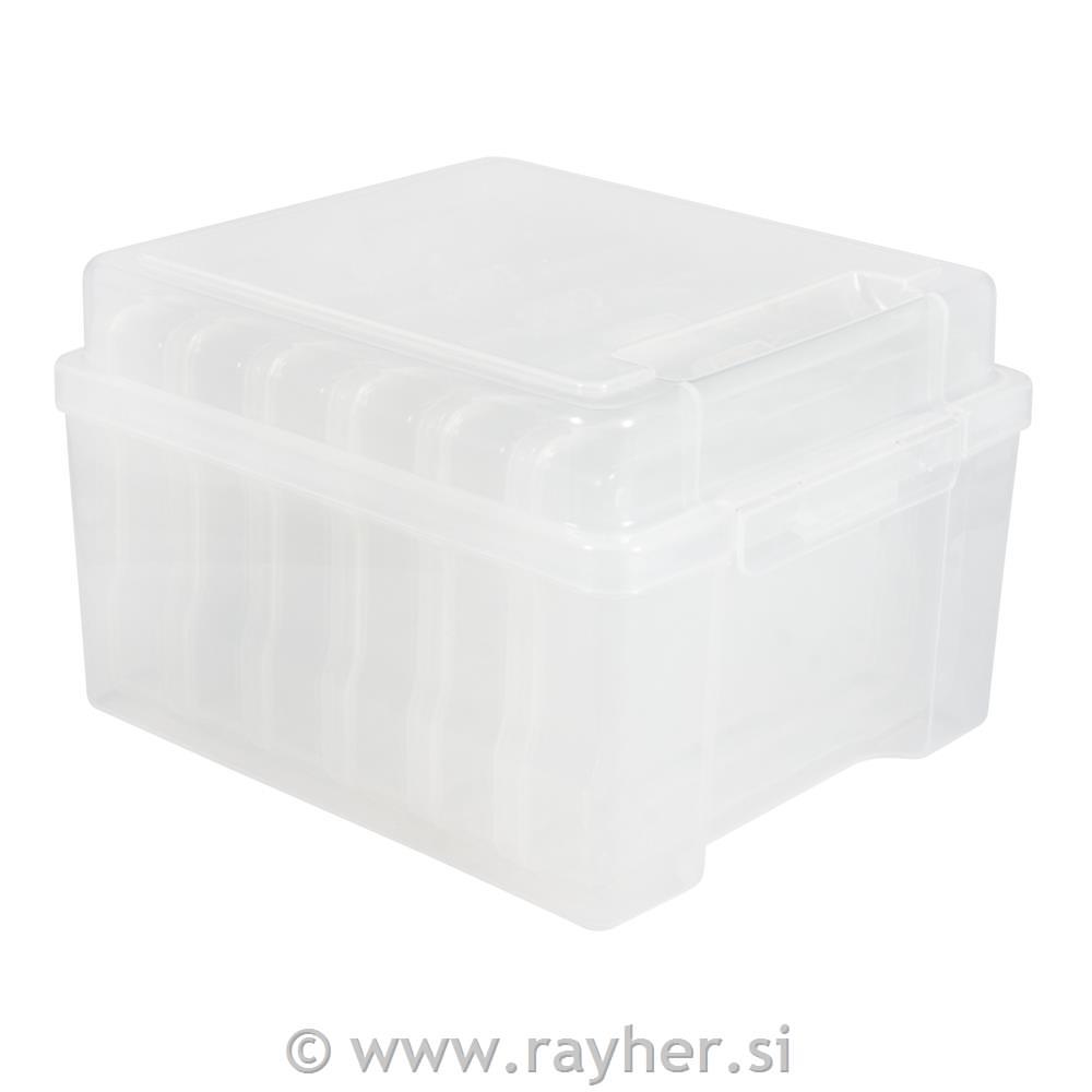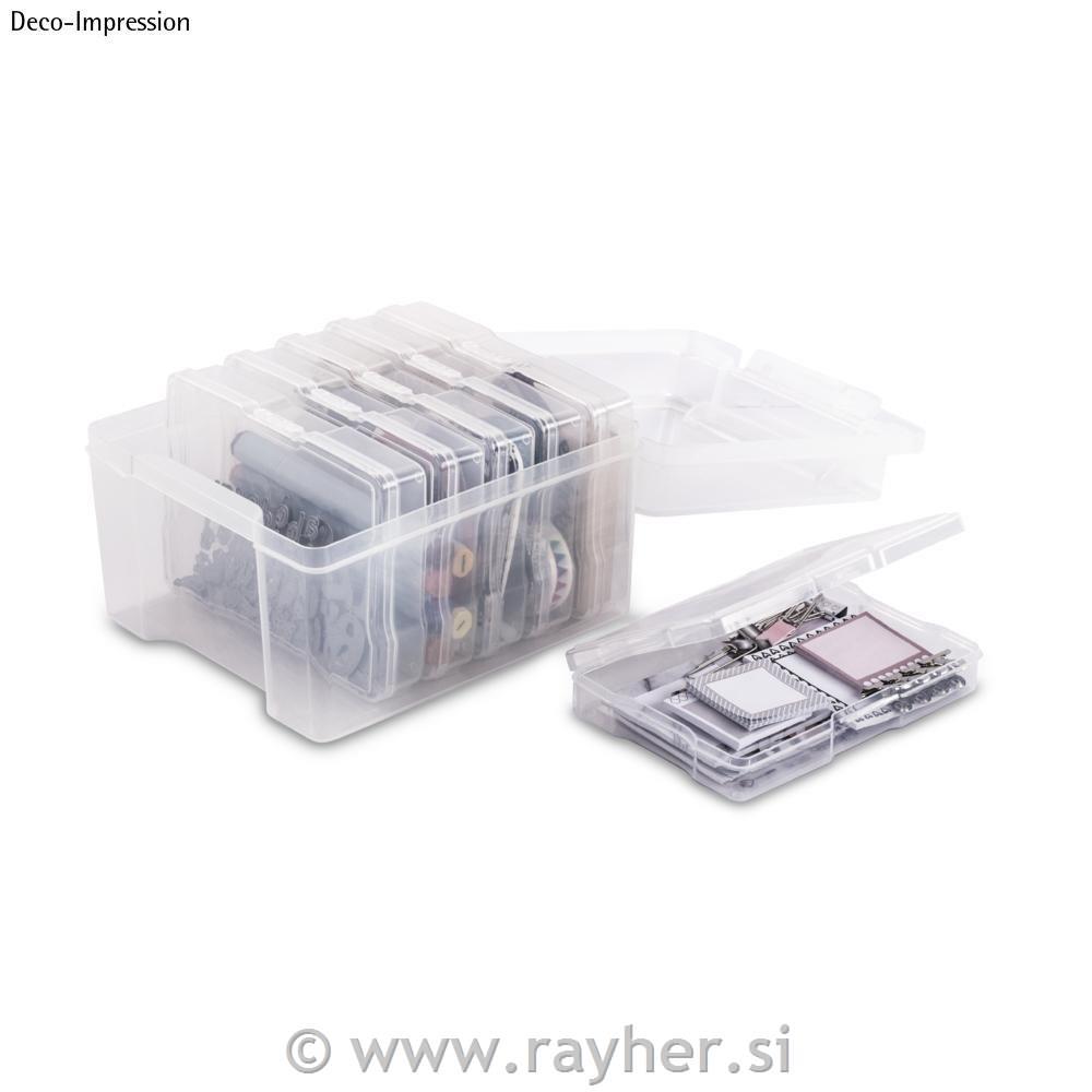 Prozorna plastična škatla s pokrovi, ki se odpirajo na eni strani, je velikosti 210x185x140 mm. Škatla vsebuje še 6 drugih snemljivih škatel velikosti cca 12x17 cm, s pokrovom na tečaju, ki se lahko tudi varno zapre.