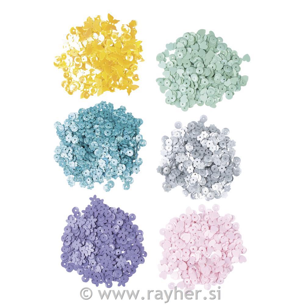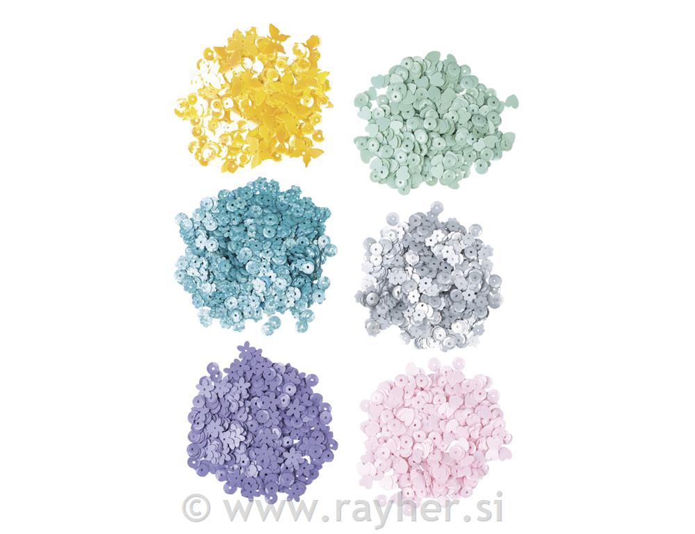 V setu je 6 barv bleščic ploščic različnih oblik po 6 g.