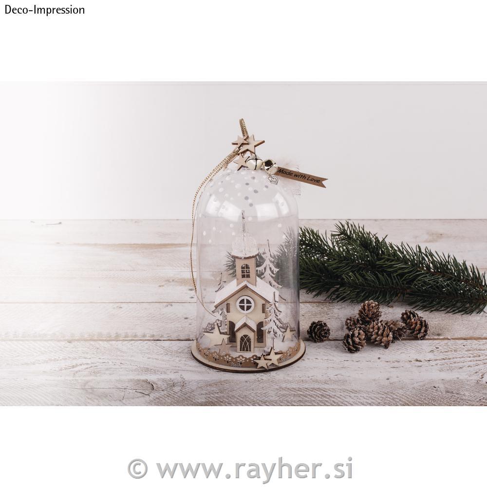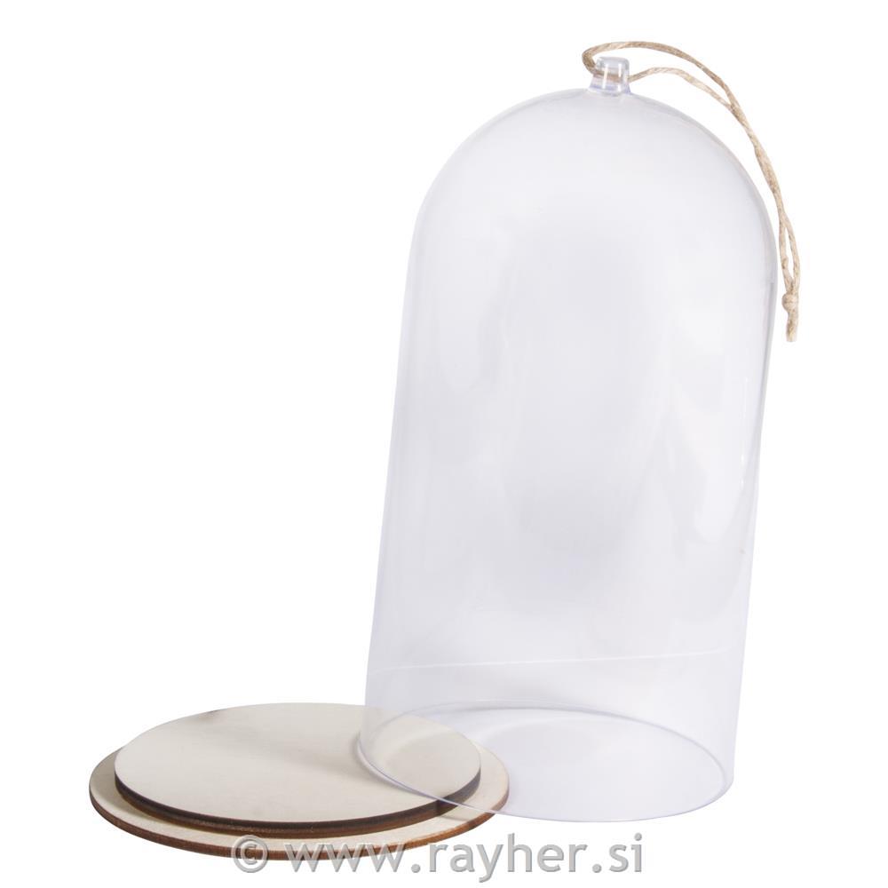 Prosojna plastična kupola je visoka 19 cm in ima okrasno vrvico iz jute. Podstavek ima premer 12 cm.