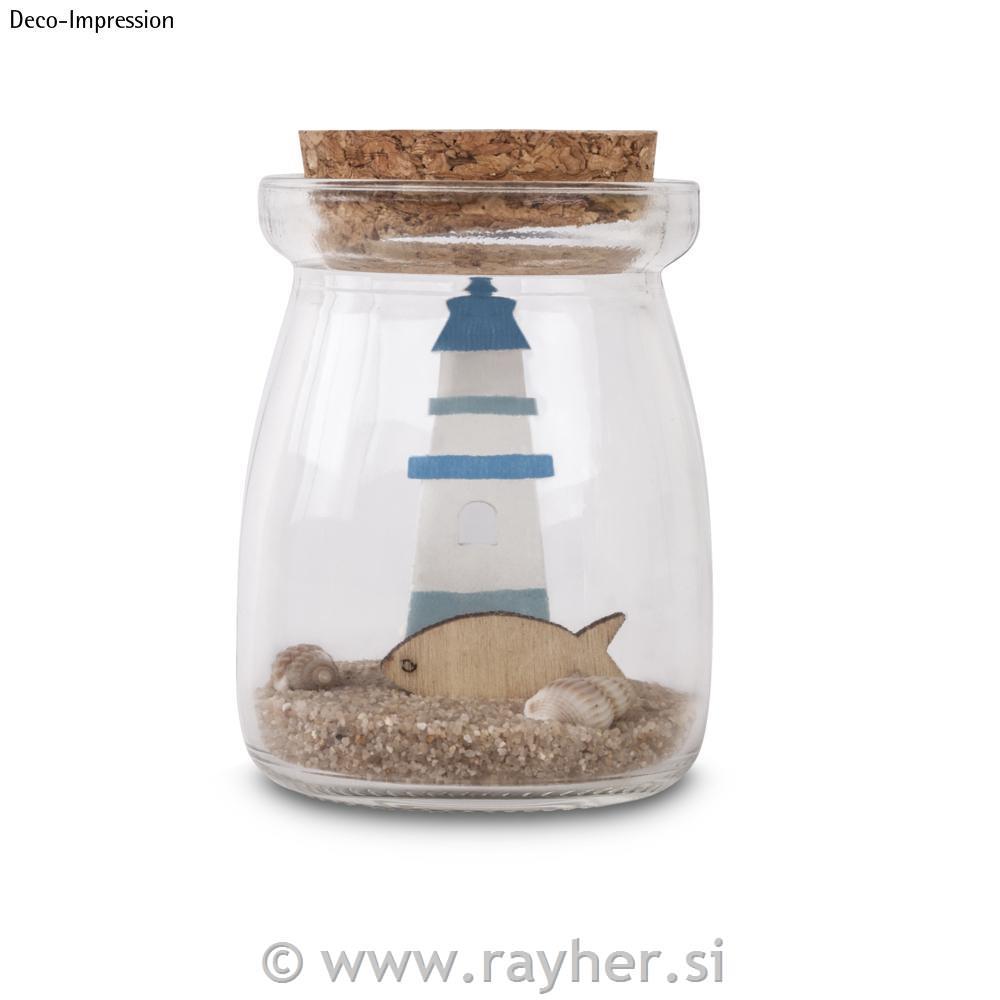 Stekleni kozarec s pokrovom iz plute, višina 7 cm, o 5 cm, odprtina 4 cm.