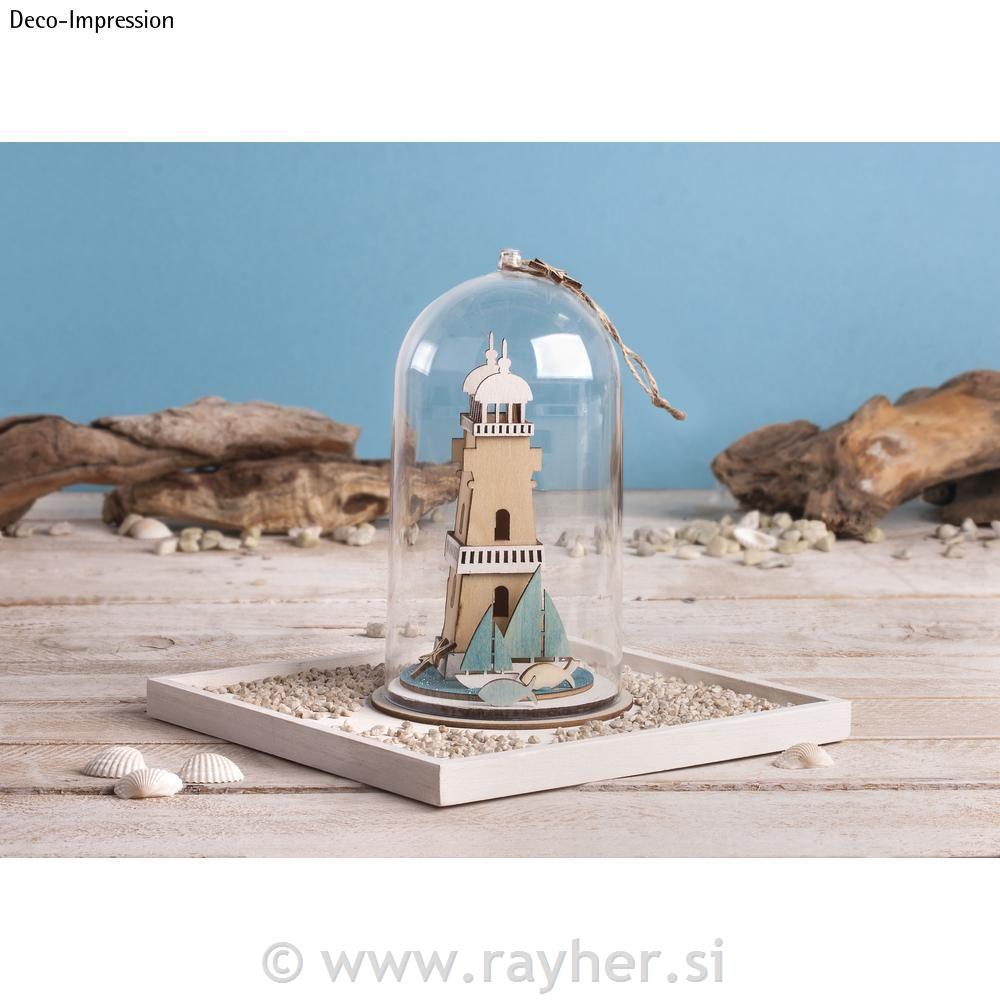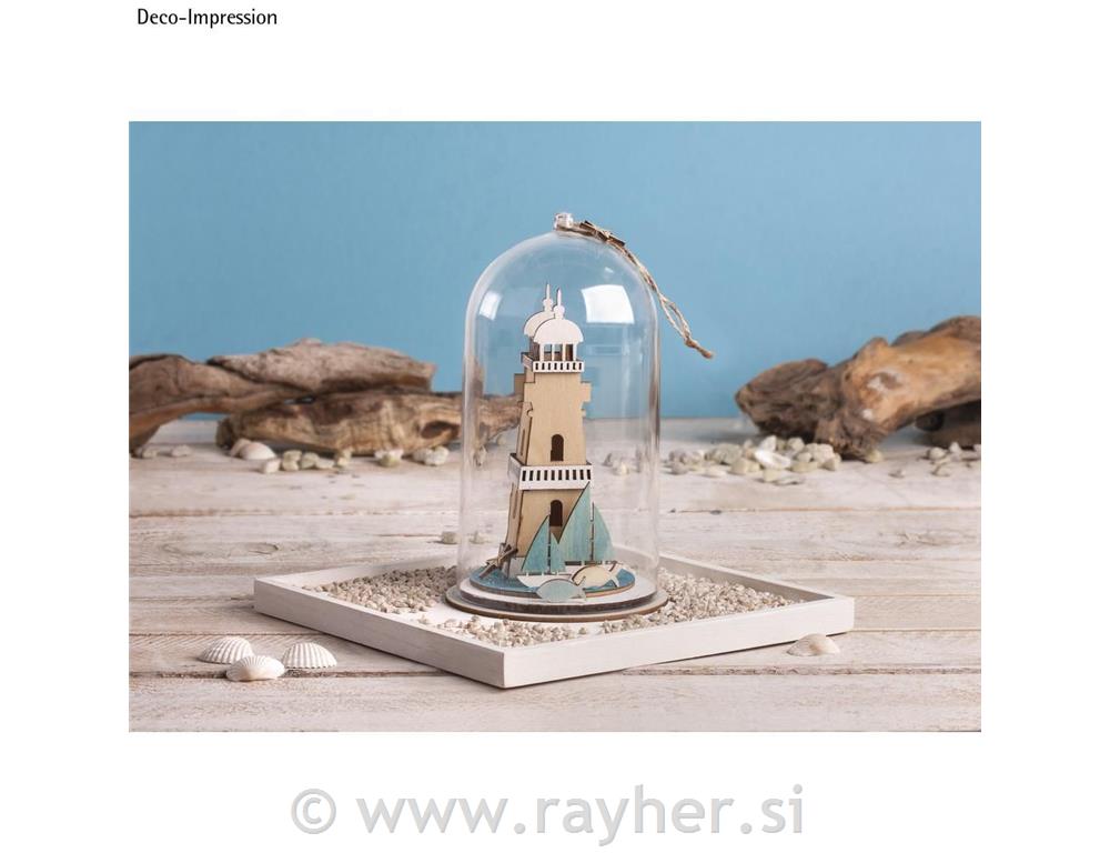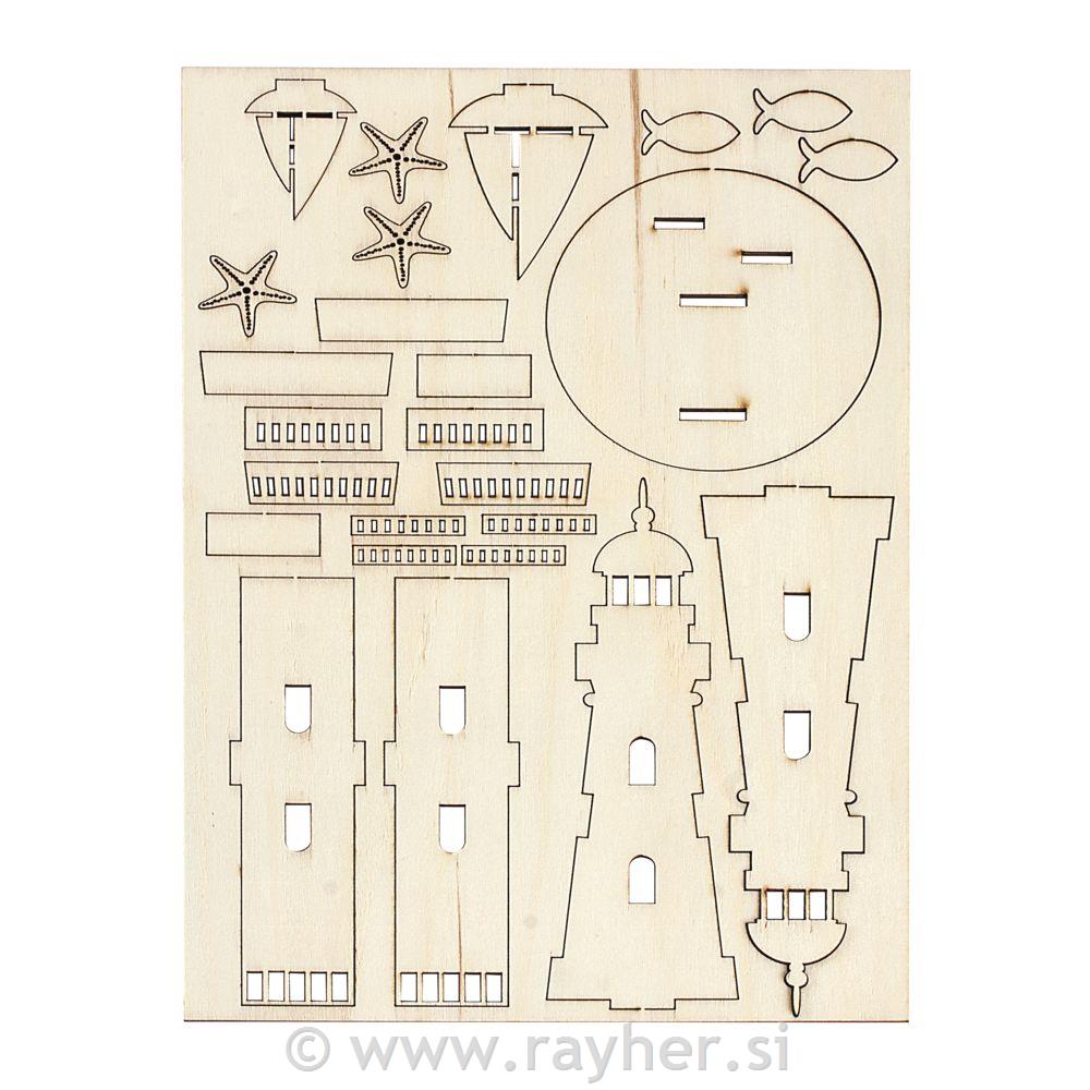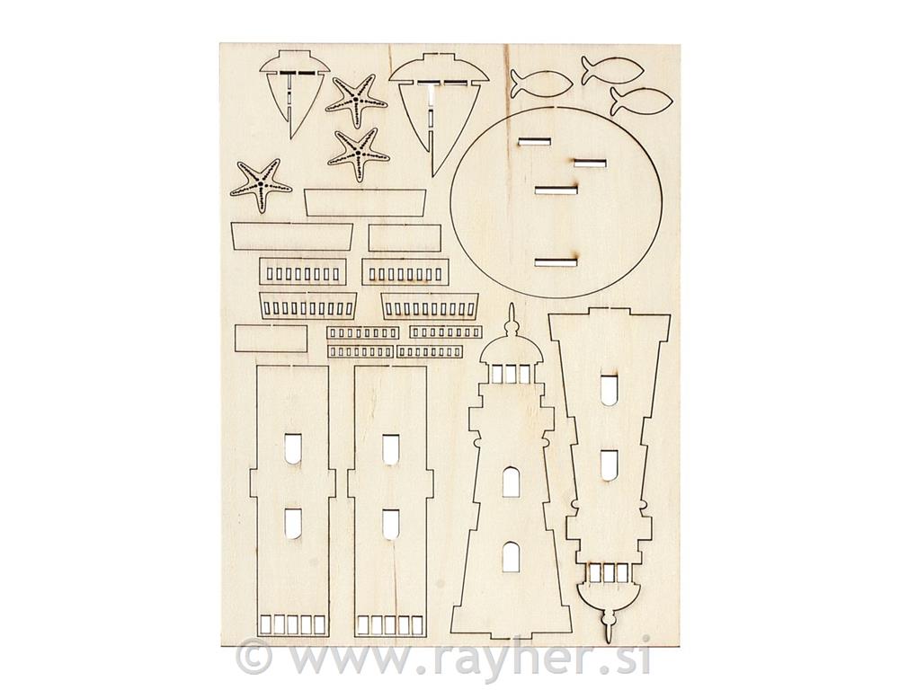 25-delni leseni komplet; 1 svetilnik, visok 14 cm, 2 jadrnici, 3 morske zvezde, 3 ribe. Potrebovali boste tudi: hobi (olfa)nož, lepilo in po želji barve, bleščice ali bleščeče lepilo. Premer osnovne plošče 8,2 cm.