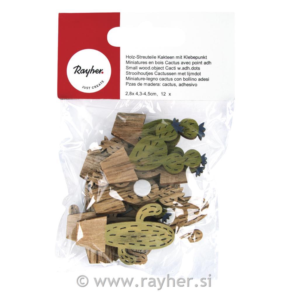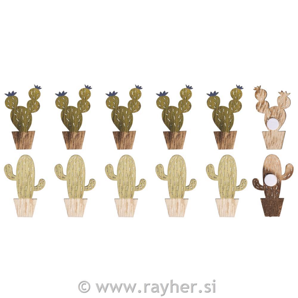 Leseni kaktusi debeline 2 mm so razvrščeni v dve vrsti in velikosti približno 2,8x4,3 cm in 2,8x4,5 cm. Leseni okraski so na hrbtni strani opremljeni z lepilno piko. To pomeni, da jih lahko hitro in enostavno prilepite na gladke površine brez drugih pripomočkov.
