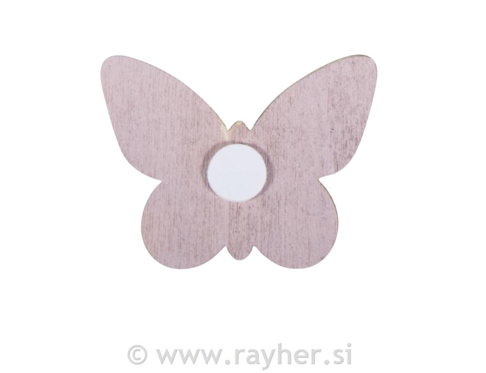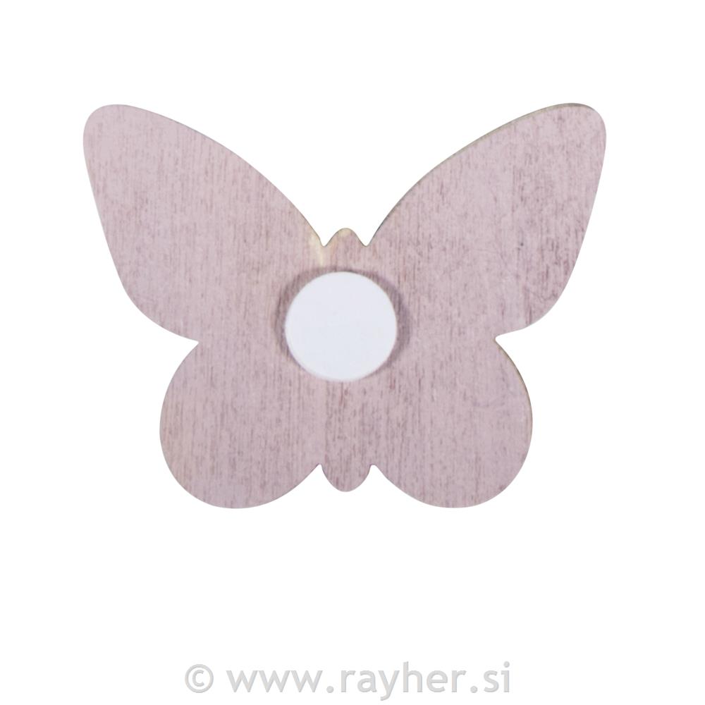 Leseni metulji dimenzijei 5x4,5x0,5 cm imajo na hrbtni strani lepilno piko. Metulji so roza barve in imajo na sprednji strani bele ornamente cvetov in metuljev. Idealna romantična dekoracija za vse, kar prihaja iz srca.