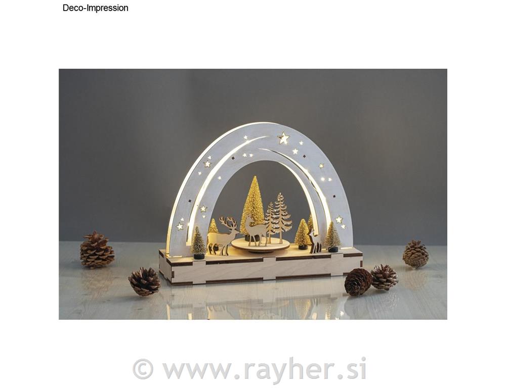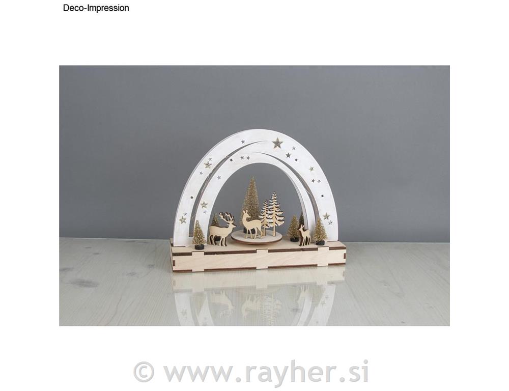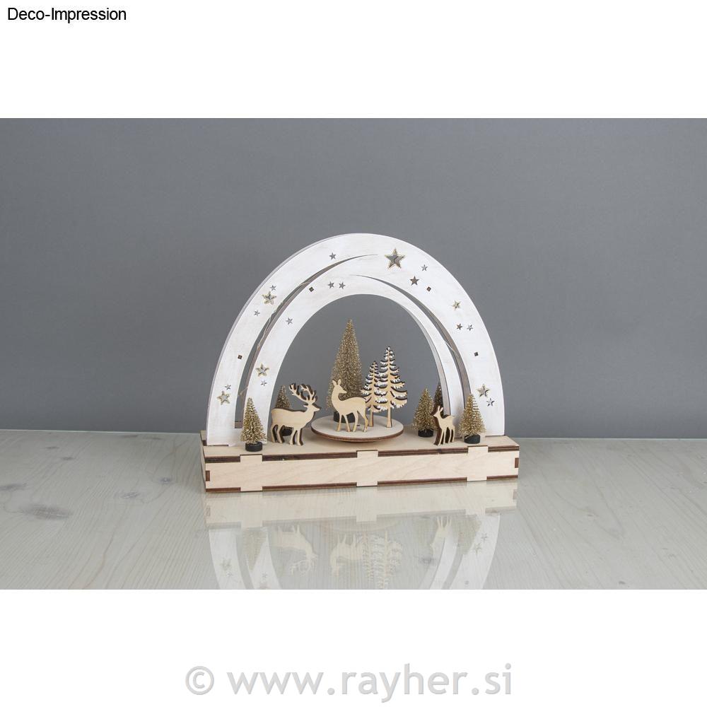 4-delni mini zimski prizor iz lesenih delov: Dvojček jelk 5 x 8 cm, jelen 5 x 6 cm, srna 3,5 x 5 cm, Bambi 3 x 4 cm (pribl. podrobnosti širina x višina). Debelina 5 mm, z lepimi rjavimi robovi.