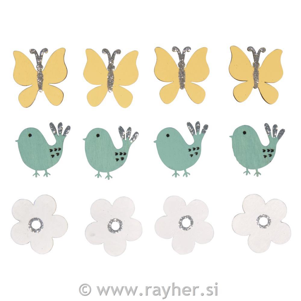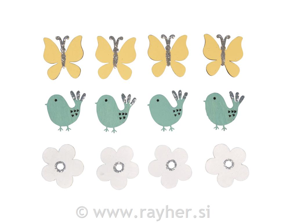 Leseni okraski, Rožice, metulji, ptički, set 12