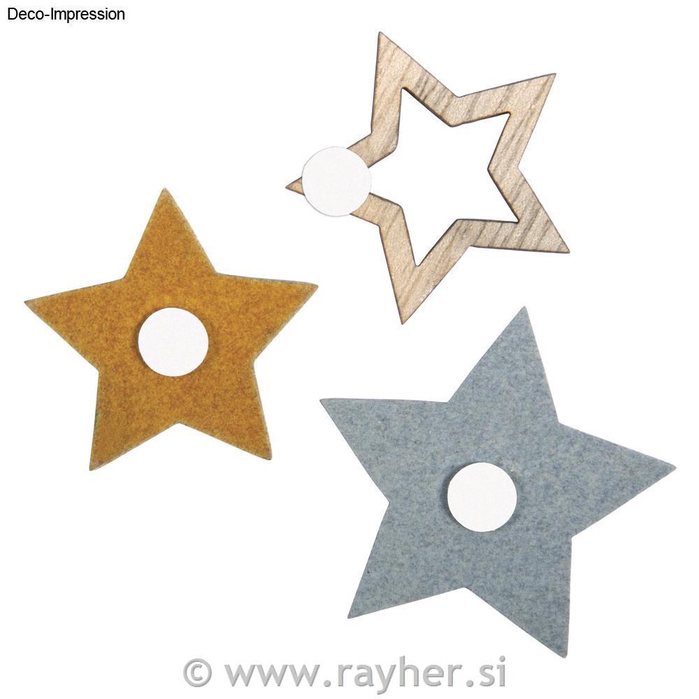 Zvezde so del božične dekoracije. Žametno posute v oker zlati in sivomodri barvi v kombinaciji z naravno, izžarevajo brezčasno, preprosto eleganco. Z lepljivo piko na hrbtni strani.