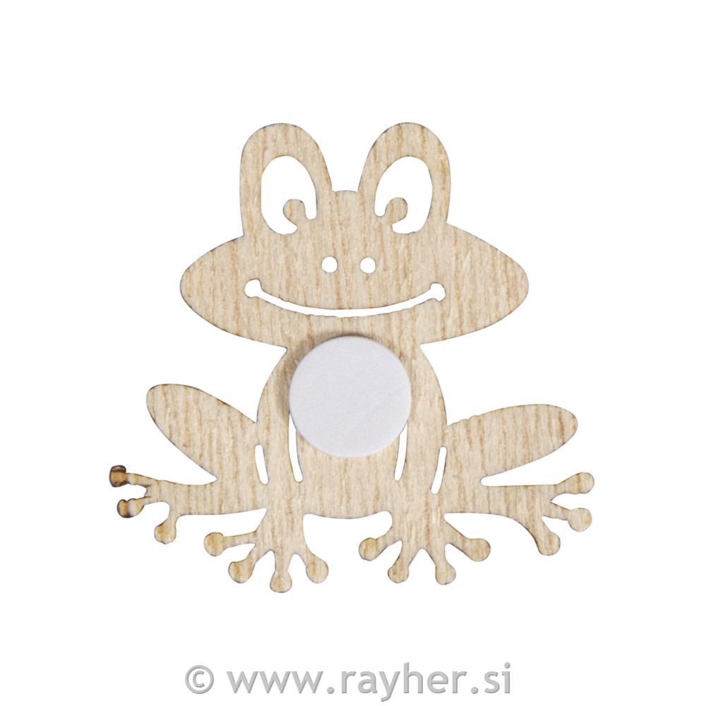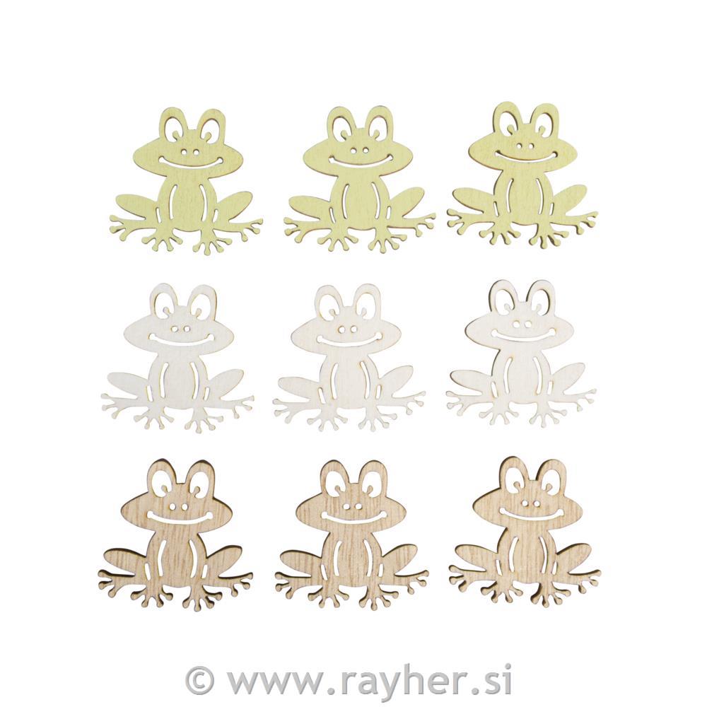 Vsebina: 9 lesenih okraskov kosov žabic, 4 x 4 cm, v barvah svetlo zelena, bela, naravna. S samolepilno piko na hrbtni strani za hitro lepljenje. Enostavno odlepite folijo in prilepite okrasek na željeno mesto.