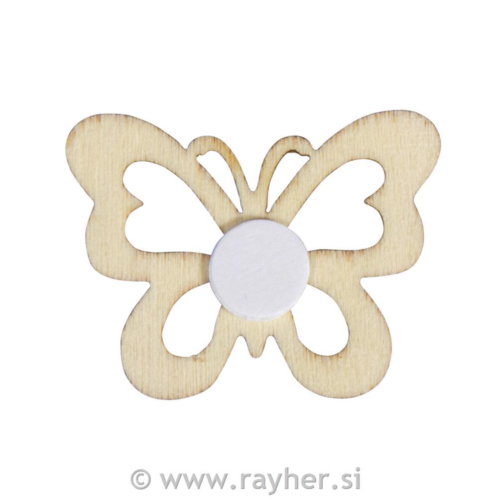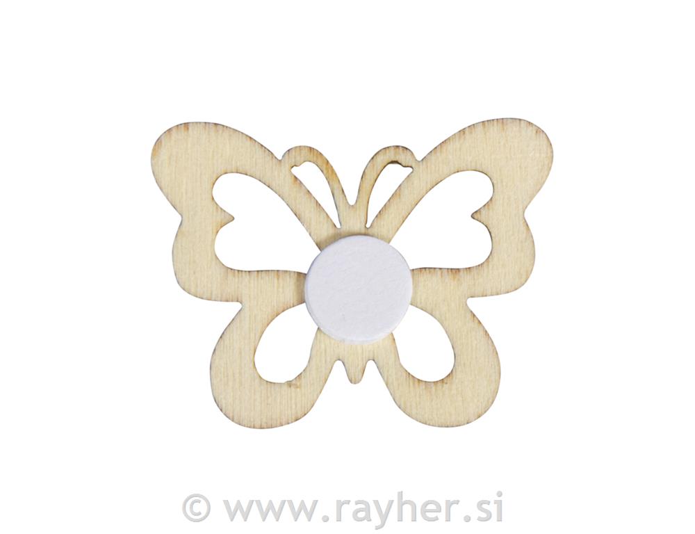 Vsebina: 9 lesenih metuljčkov, 3 x 4 cm, v rumeni, beli in naravni barvi. S smnolepilno piko na hrbtni strani za hitro lepljenje. Enostavno odlepite folijo in jo prilepite.