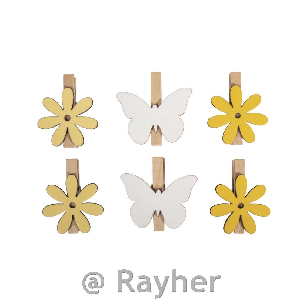 Vsebina: 6 lesenih ščipalk z lesenimi motivi, 4-5 cm, 4x rože v različnih odtenkih rumene barve, 2x metulji v beli barvi (ščipalka 5 cm).