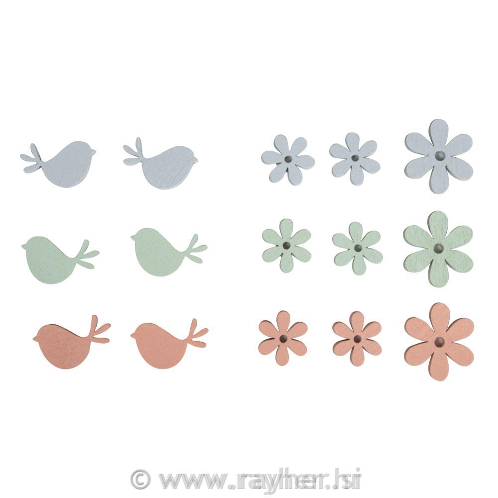Leseni ptički in cvetje 2,3-3,3cm 15 kosov