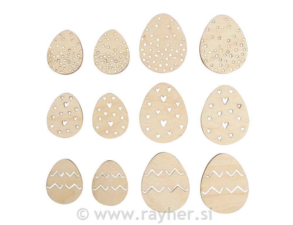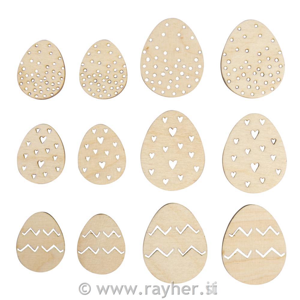 Vsebina: 12 lesenih velikonočnih jajc, 2 velikosti, 3 različni vzorci: 6 jajc približno 3 x 4 cm, 6 jajc približno 2,2 x 3 cm. Različni ljubki vzorci so izrezani z lasersko tehniko, rob jajc je temno rjav.