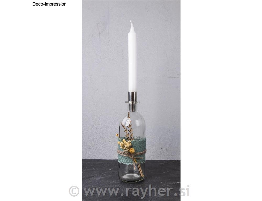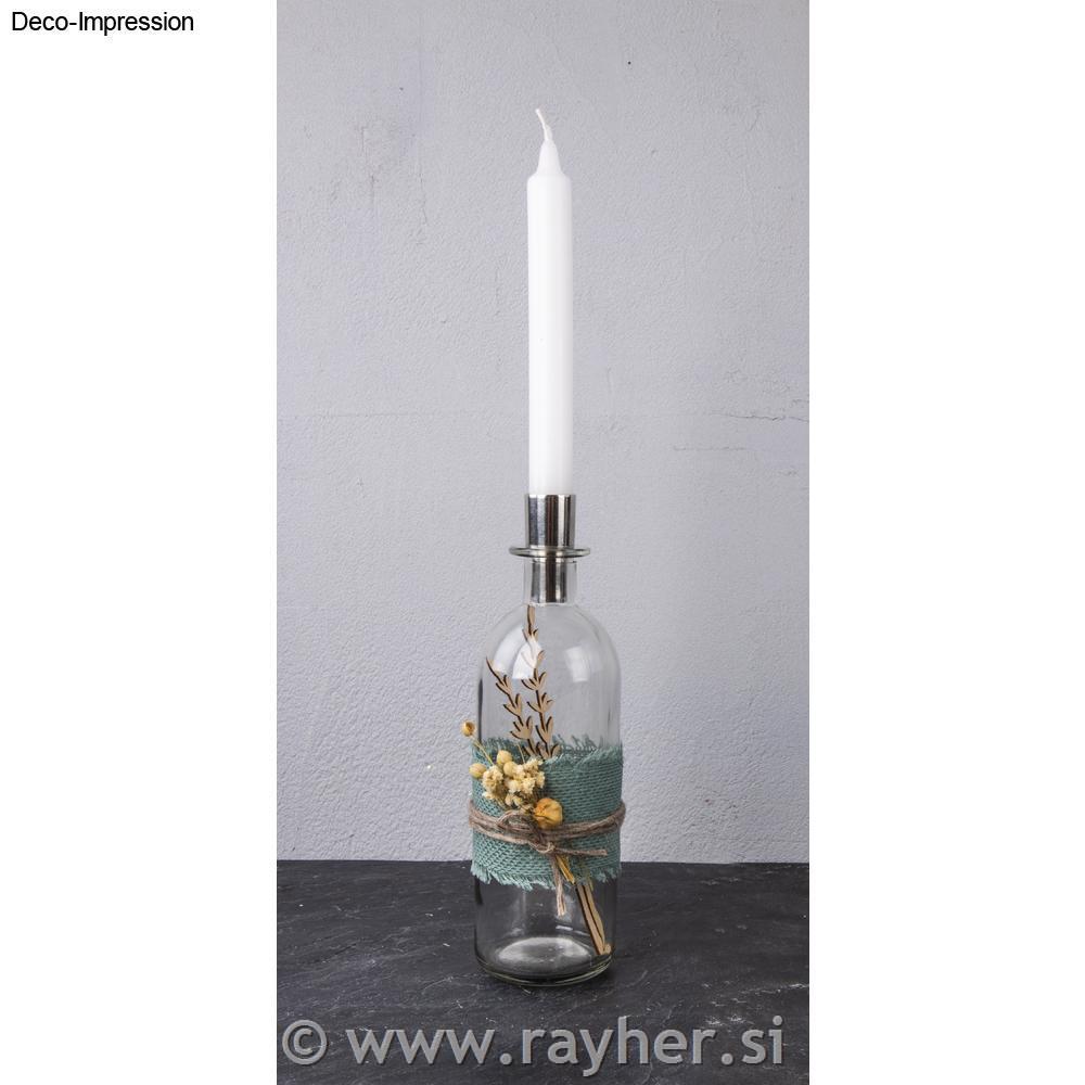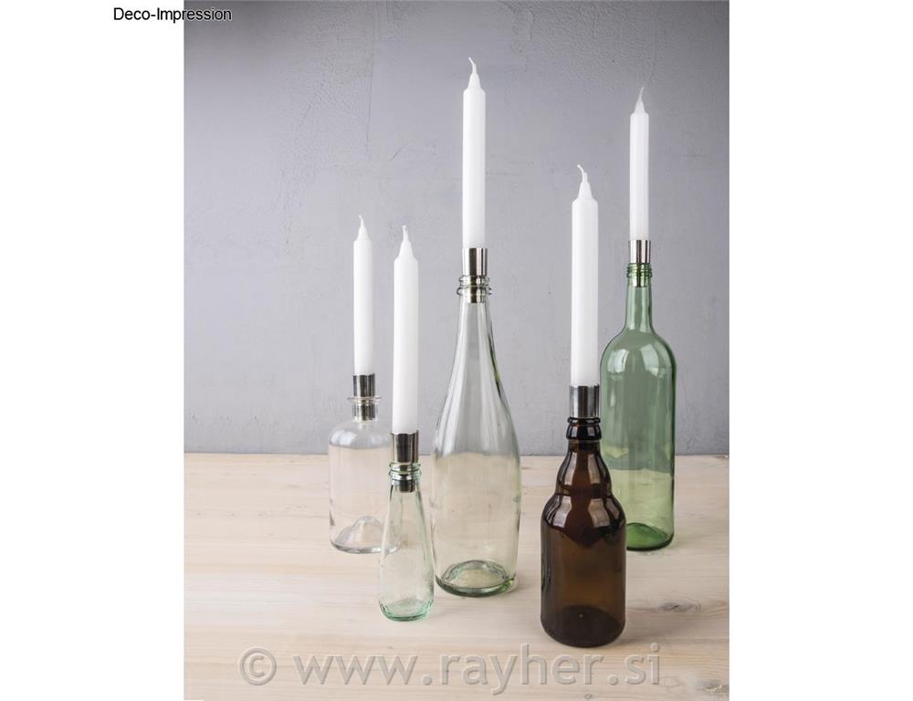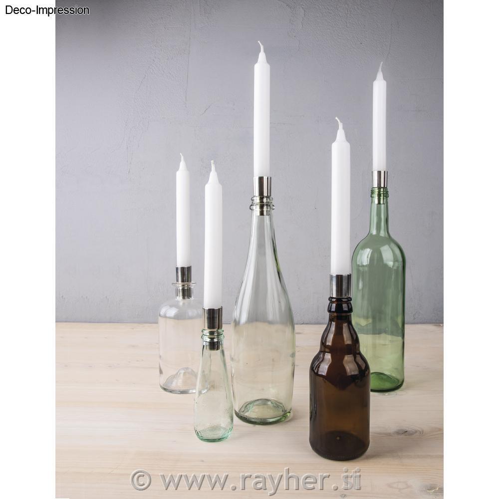 Kovinski držala za sveče za steklenice, 2 kosa, za palične sveče. Primeren za steklenice z odprtino za ustje od 18 mm naprej. Notranji premer svečnika je 22 mm, skupna višina 50 mm.