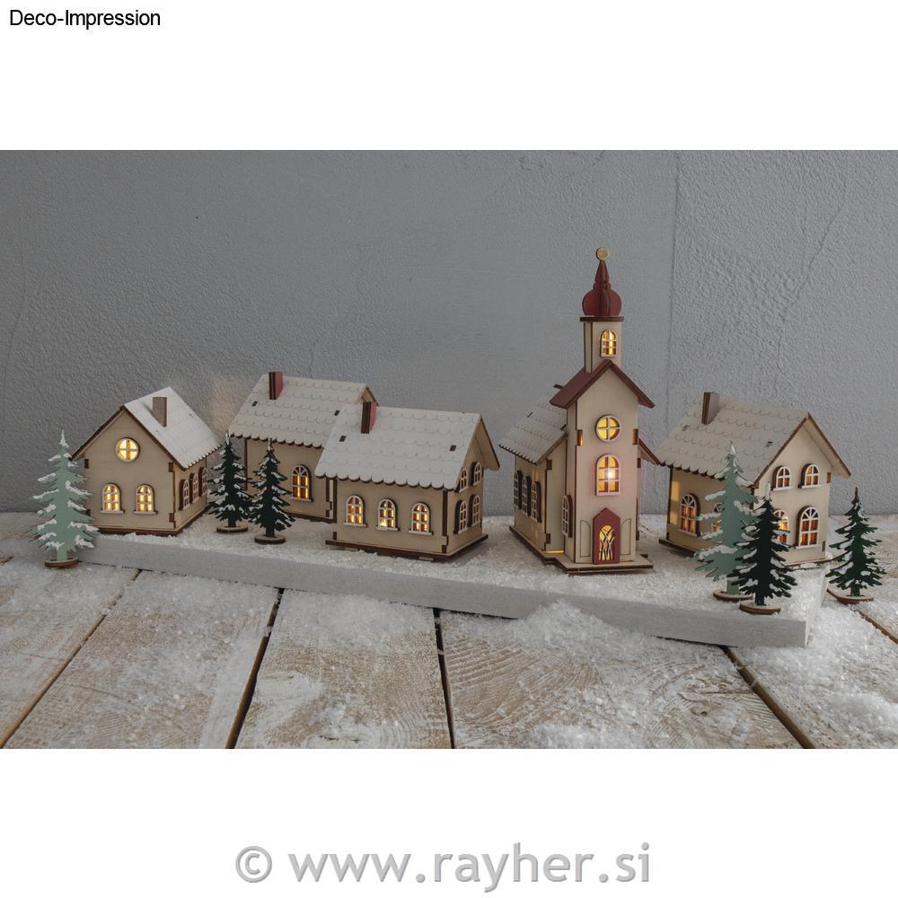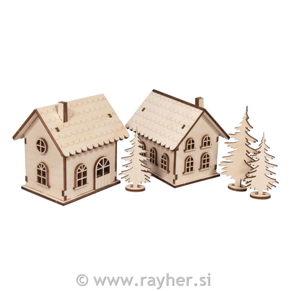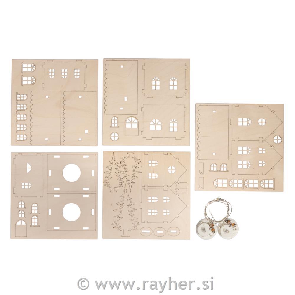 Posamezni deli kompleta so izdelani iz lasersko rezanega lesa, debeline približno 3 mm, in jih je mogoče enostavno odstraniti z obrtnim nožem in sestaviti po podrobnih, oštevilčenih navodilih. Posamezne kose lahko po želji pobarvamo, okrasimo, bleščimo, okrasimo s strukturnim snegom in še marsikaj. Hiše je mogoče osvetliti od znotraj skozi majhno odprtino z nizom LED luči.