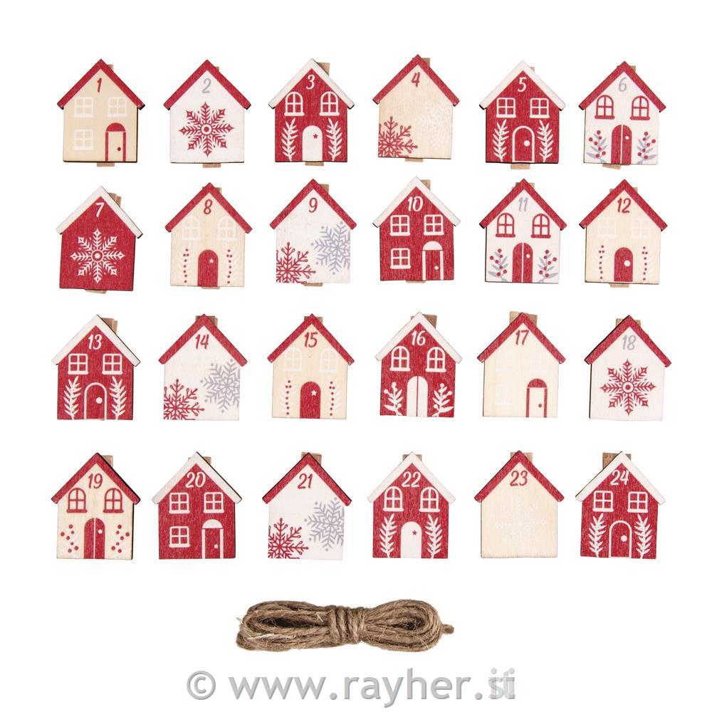 Adventne številke ščipalke, hišice + vrvica 3x3.5cm, set 24