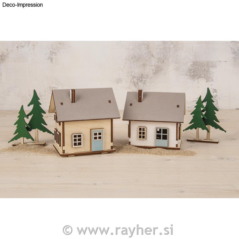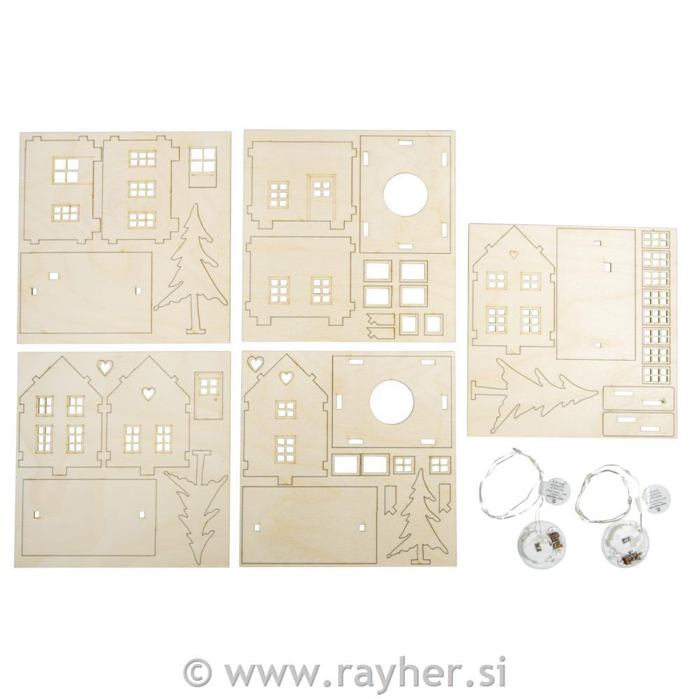 Elementi so izrezani iz približno 3 mm debelega lesenega materiala, deli pa se enostavno izrežejo z nožkom in sestavijo po podrobnih navodilih. Po želji lahko posamezne dele pobarvate, okrasite, posujete z bleščicami, dodate strukturo snega itd.