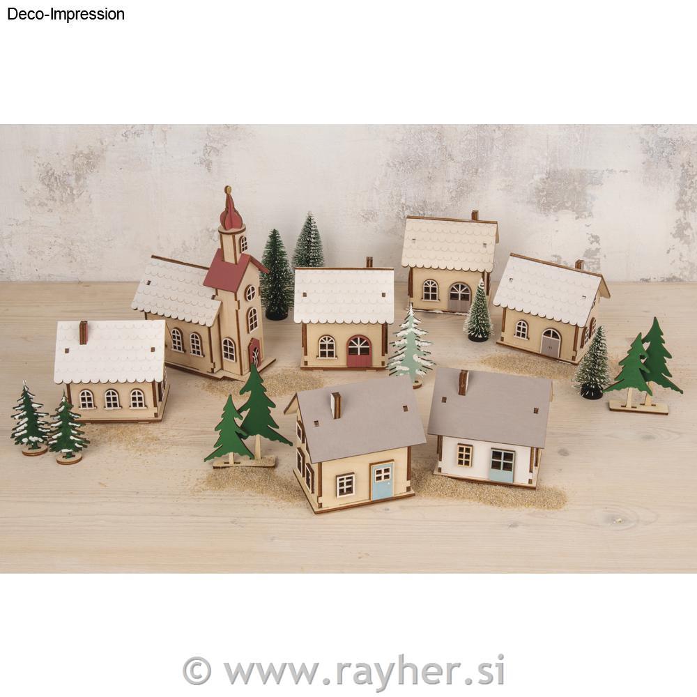 Romantična idila vasi v mini formatu! Komplet za sestavljanje z natančno izdelanimi lesenimi hišicami, smrečicami in LED-lučkami, ki hišicam pričarajo prijetno, toplo svetlobo.
