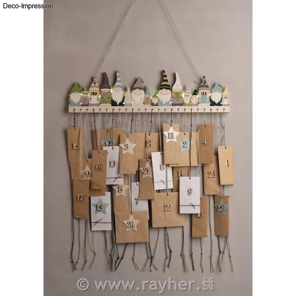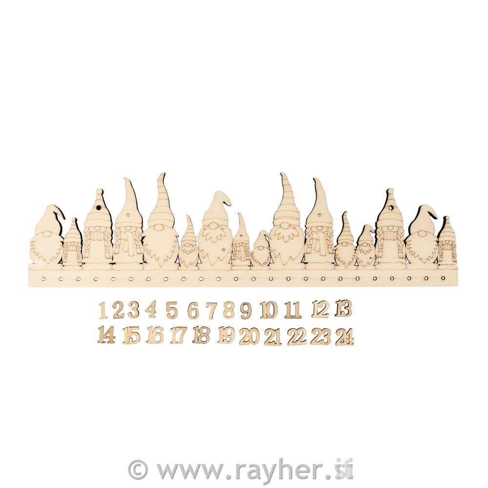 Čudovita lesena letvica s 24 luknjami za obešanje paketkov in priloženimi lesenimi številkami (1–24) z lepilnimi pikami. Motivi škratkov so lasersko gravirani in krasijo vsak dom – pobarvani ali naravni.