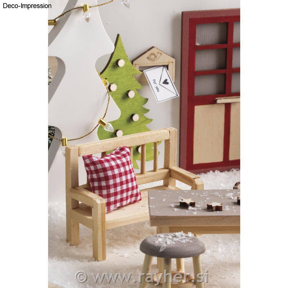 rayher.si Hobi program Dekorativni izdelki, okraski in urni mehanizmi Miniature Mini klop z blazinama Mini klop iz lesa, velikost 8 x 3,5 cm, višina 6,2 cm, z dvema karo blazinicama. Aktualna cena:6,99 € Šifra artikla:46820000 Blagovna znamka:Rayher Zaloga: na zalogi Dodaj v košarico kos