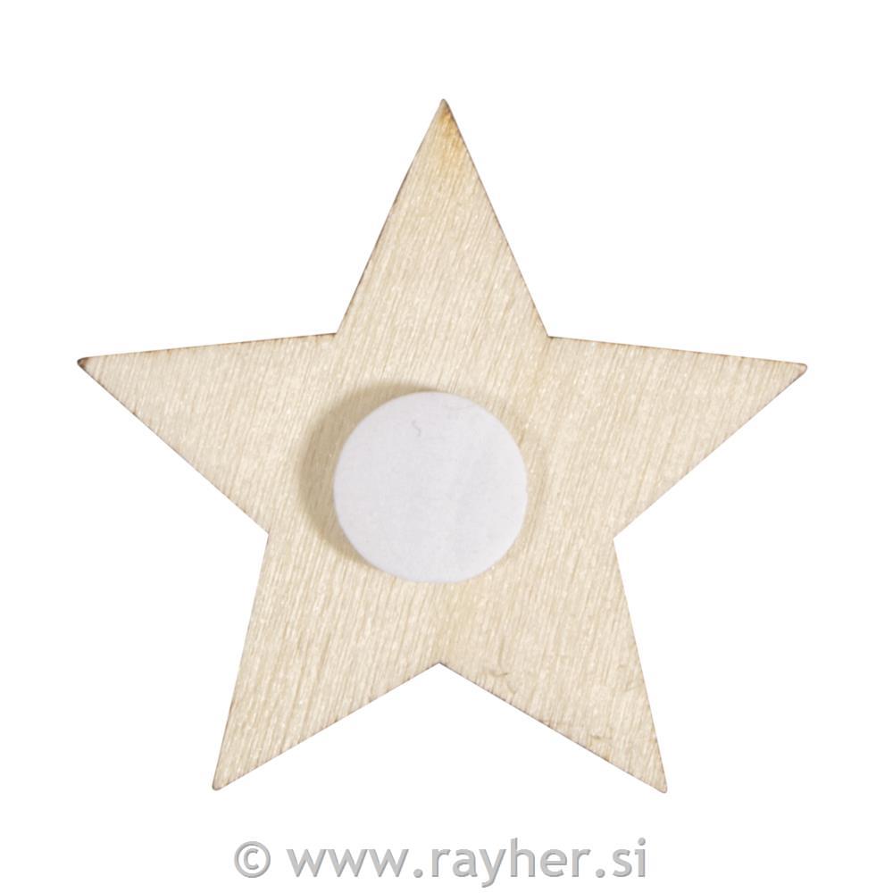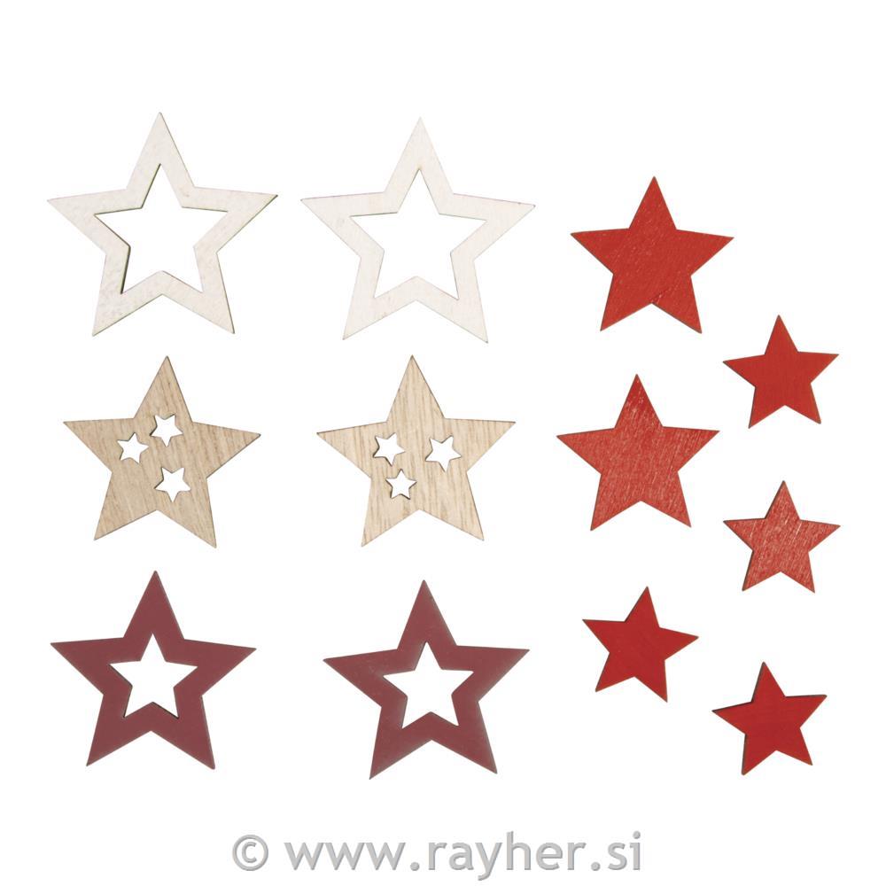 Vsebina: 12 lesenih okrasnih zvezdic, premera od 2,2 do 4,4 cm, za hitro lepljenje z lepilno točko na zadnji strani.