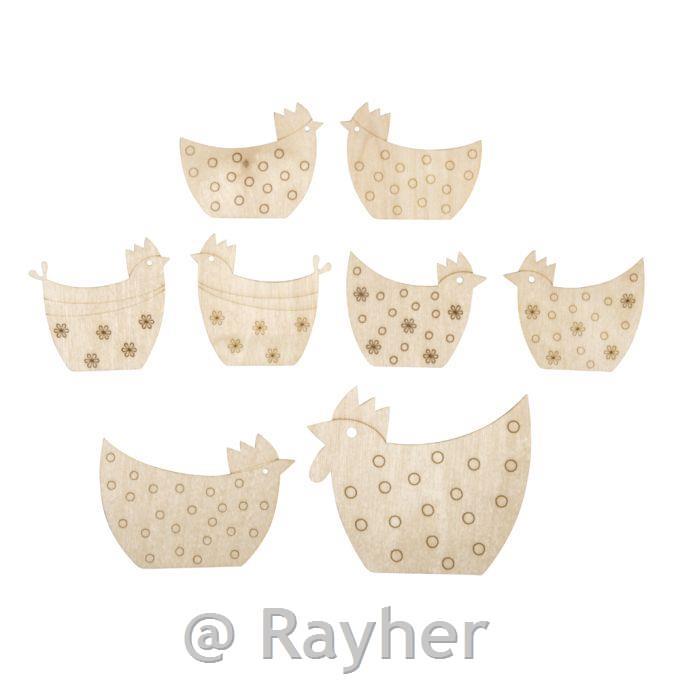 Leseni okraski kokoške in petelini, 5-8 cm, deb.1 mm, 8 kosov