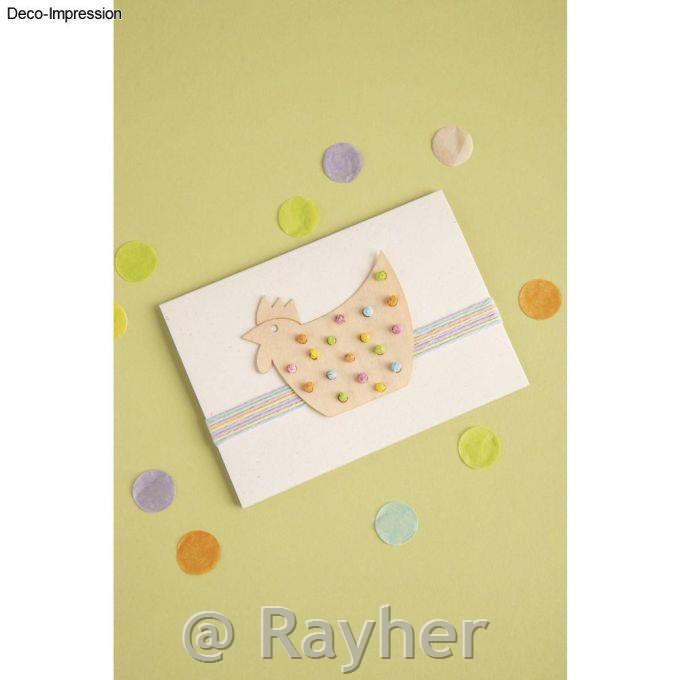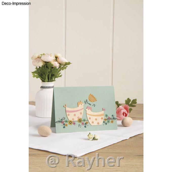 Izjemno tanki motivi iz furnirnega lesa imajo debelino 1 mm. Motive je mogoče rahlo upogniti in prilepiti npr. okoli lampijona. Ti tanki motivi izgledajo odlično nalepljeni na papirnate vrečke, voščilnice in še veliko več. Vsebina: 8 motivov: petelin 8x6,5 cm, kokoši 7x4,7 cm + 5x4 cm + 5x4,2 cm + 5x4,6 cm