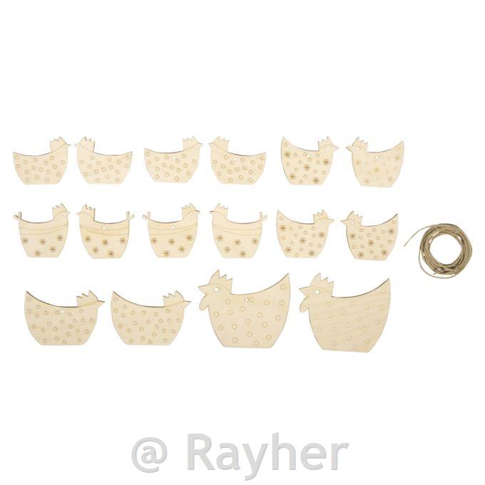 Leseni okraski obešanka kokoške in petelini, 5-8 cm + 2,5 m vrvica 16 kosov